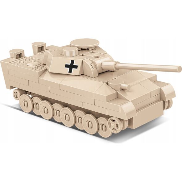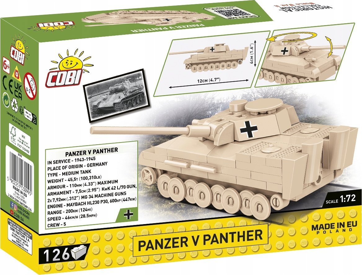KLOCKI COBI 3099 Czołg Panzer V Panther HC WW2 126 El.SPECYFIKACJA PRODUKTU: Marka: Cobi Seria: Historical Collection World War II Ilość elementów: 126 szt. Ruchome elementy: Tak Wymiary modelu (dł./szer./wys.): 12 cm / 4 cm / 4.5 cm Skala modelu: 1:72 /szer./wys.): 20 cm / 14 cm / 5 cm Zawiera instrukcje obsługi: Tak Grupa wiekowa: 6+ Klocki Cobi to wysokiej jakości, estetycznie zapakowane zestawy klocków idealne na prezent. Produkowane w Polsce Wspieraj rozwój swojego dziecka. Zabawa klockami Cobi wzbogaca kreatywność, logiczne myślenie i zdolności manualne. Budowanie z klocków to również rozwój małej motoryki oraz wobraźni małego konstruktora. Klocki tej marki to nie tylko produkt dla dzieci, to przede wszystkim wysokiej jakości klocki, z których ucieszy się każdy pasjonata militariów, lotnictwa itp. Klocki Cobi są odwzorowaniem realnych modeli. Zestawy produkowane są w różnej skali, część z nich zawiera espozytor dzięki czemu możesz zbudować piękną kolekcję. 126 wysokiej jakości elementów, wyprodukowane w UE przez firmę z ponad 20-letnią tradycją, spełniają normy bezpieczeństwa dotyczące produktów dla dzieci, w pełni kompatybilne z innymi markami klocków konstrukcyjnych, klocki z nadrukami nie odkształcają się i nie bledną w czasie zabawy czy pod wpływem temperatury, Wymiary modelu (dł x szer x wys): 12 cm (4.7”) x 4 cm (1,6”) x 4,5 cm (1.8”)Panzer V Panther to do dzisiaj jeden z najbardziej rozpoznawalnych czołgów niemieckich z okresu II wojny światowej. Pantery weszły do służby w 1943 roku i swój chrzest bojowy zaliczyły podczas bitwy na Łuku Kurskim. Pomimo początkowych trudności technicznych szybko okazało się, że Pantery górują nad radzieckimi T-34 i amerykańskimi Shermanami. Gruby pancerz, zaawansowana konstrukcja, wysoka celność i jedna z najlepszych drugowojennych armat uczyniły Panterę niezwykle groźną i skuteczną bronią, budzącą respekt aż do zakończenia wojny!Kompatybilne z innymi znanymi markami klocków.Mini model z klocków konstrukcyjnych COBI został zaprojektowany w skali 1:72 i składa się ze 126 wysokiej jakości elementów. Po zbudowaniu czołg ma 12 cm długości. Pomimo kompaktowego rozmiaru model zachował wszystkie najważniejsze cechy swojego historycznego pierwowzoru! Na bokach pojazdu znajdują się nadrukowane oznaczenia niemieckie. Wieża czołgu jest ruchoma i można nią obracać. Lufa porusza się w kierunku góra-dół. Model nadaje się w sam raz na dobry początek przygody z klockami konstrukcyjnymi COBI. Pantera to również ciekawy model i gadżet dla kolekcjonerów. Zajmuje niewiele miejsca i z łatwością znajdzie swoje miejsce na biurku w domu, w pracy czy też na regale z książkami.Jeżeli jesteś zaawansowanym klockowym konstruktorem, to ten model dostarczy Ci bardzo ciekawych elementów. Wyraź swoją pasję poprzez klocki i buduj historię klocek po klocku!