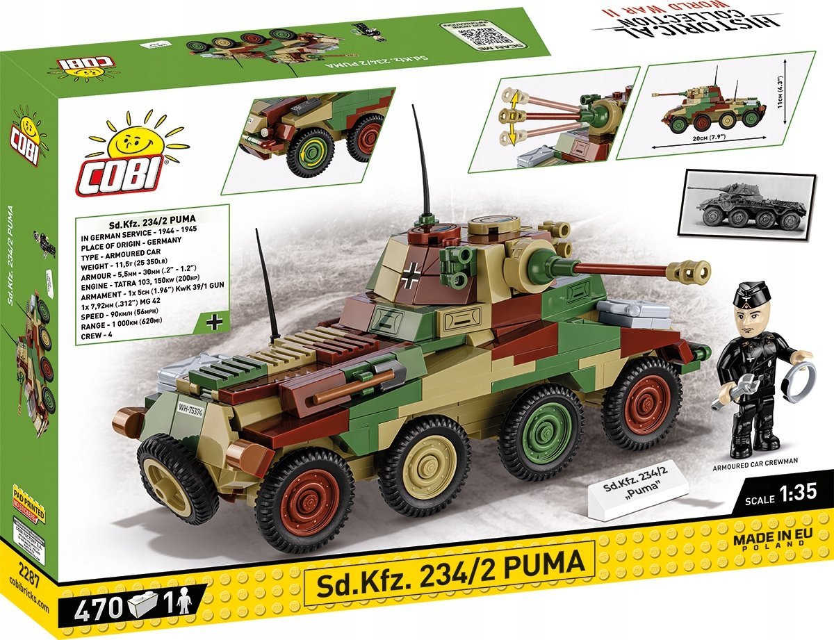 COBI BLOCKS 2287 SD.KFZ.234/2 PUMA TANK ΘΩΡΑΚΙΣΜΕΝΟ ΣΤΡΑΤΙΩΤΙΚΟ ΑΥΤΟΚΙΝΗΤΟ⭐⭐⭐ ΔΩΡΕΑΝ ΚΑΤΑΛΟΓΟΣ! ⭐⭐⭐ ✅ Ο ΚΑΤΑΛΟΓΟΣ ΕΙΝΑΙ ΣΕ ΧΑΡΤΙΝΗ ΜΟΡΦΗ! ✅Τα μπλοκ Cobi είναι υψηλής ποιότητας, αισθητικά συσκευασμένα σετ μπλοκ, τέλεια για δώρο. Παράγεται στην Πολωνία Υποστηρίξτε την ανάπτυξη του παιδιού σας. Το παιχνίδι με τα μπλοκ Cobi εμπλουτίζει τη δημιουργικότητα, τη λογική σκέψη και τις χειρωνακτικές δεξιότητες. Η κατασκευή με μπλοκ αναπτύσσει επίσης τις λεπτές κινητικές δεξιότητες και τη φαντασία ενός μικρού κατασκευαστή. Τα μπλοκ αυτής της μάρκας δεν είναι μόνο ένα προϊόν για παιδιά, είναι πάνω από όλα υψηλής ποιότητας μπλοκ με τα οποία θα είναι ευχαριστημένος κάθε λάτρης του στρατού, της αεροπορίας κ.λπ. είναι αντίγραφα πραγματικών μοντέλων. Τα σετ παράγονται σε διάφορες κλίμακες, μερικά από αυτά περιλαμβάνουν οθόνη ώστε να μπορείτε να φτιάξετε μια όμορφη συλλογή Το μπλοκ μοντέλο του γερμανικού βαρέως θωρακισμένου αυτοκινήτου Sd.Kfz 234/2 PUMA σχεδιάστηκε σε κλίμακα 1:35 χρησιμοποιώντας 470 στοιχεία. . Μόλις κατασκευαστεί, το όχημα έχει μήκος 20 cm και το μέγεθός του ταιριάζει τόσο στις φιγούρες όσο και στα άλλα οχήματα που δημοσιεύουμε σε αυτήν την κλίμακα. Το όχημα εντυπωσιάζει με την πολύ προσεγμένη σχεδίαση, το καμουφλάζ και τις εκτυπώσεις του, που το καθιστούν ένα πολύ σημαντικό στοιχείο στην Ιστορική Συλλογή COBI. Δεν υπάρχουν αυτοκόλλητα εδώ, χρησιμοποιούμε μόνο μόνιμες εκτυπώσεις. Το όχημα διαθέτει κινητά στοιχεία όπως τροχούς, πυργίσκο και κανόνι. Το σετ περιλαμβάνει ένα ειδώλιο που απεικονίζει ένα μέλος του πληρώματος ενός θωρακισμένου αυτοκινήτου. Ολόκληρο το σετ συμπληρώνεται από μια πινακίδα με το όνομα του οχήματος. Το σετ είναι απαραίτητο όχι μόνο για τους νέους λάτρεις της ιστορίας αλλά κυρίως για τους ενήλικες συλλέκτες και τους λάτρεις της στρατιωτικής τεχνολογίας. Ιστορία κατασκευής, τούβλο προς τούβλο! Συμβατό με άλλες γνωστές μάρκες τούβλου Διαστάσεις μοντέλου (μήκος /πλάτος/ύψος): 20 cm / 11 cm / 7,5 cm Κλίμακα μοντέλου: 1:35 / πλάτος / ύψος): 40 cm / 28 cm / 6 cm Περιλαμβάνεται εγχειρίδιο οδηγιών: Ναι Ηλικιακή ομάδα: 8+ Sd. Kfz. Το 234/2 Puma είναι ένα γερμανικό τεθωρακισμένο τροχοφόρο όχημα που χρησιμοποιήθηκε κατά τον Β' Παγκόσμιο Πόλεμο. Ήταν εξοπλισμένο με ένα πυροβόλο των 50 χλστ. τοποθετημένο σε έναν πλήρως θωρακισμένο πυργίσκο. Από τον Σεπτέμβριο του 1943 έως τον Σεπτέμβριο του 1944, κατασκευάστηκαν 101 από αυτά τα οχήματα. Το αυτοκίνητο είχε κινητήρα ντίζελ Tatra 103 και είχε σημαντική μέγιστη ταχύτητα έως και 90 km/h. Εκτός δρόμου, απέδωσε σχεδόν εξίσου καλά με τα οχήματα που παρακολουθούσε.