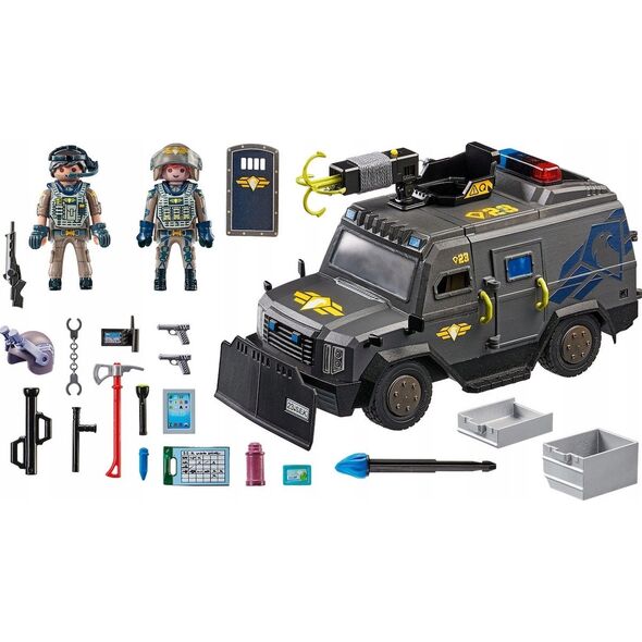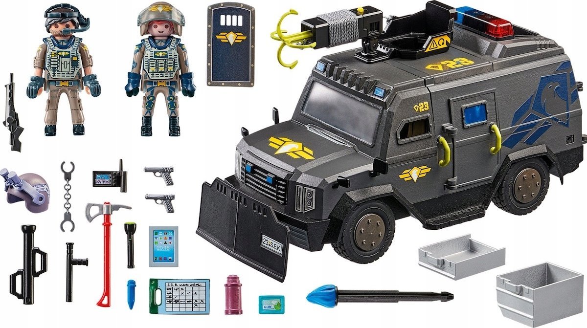 PLAYMOBIL POJAZD TERENOWY JEDNOSTKI SPECJALNEJ 71144UWAGA PROMOCJA! GRATIS ZESZYT ! WZÓR JEST NIESPODZIANKĄ!Niezwykle szczegółowe i realistycznie wyglądające detale inspirują dzieci do budowania własnego „mini świata', w którym odgrywają scenki i wchodzą w role poszczególnych postaci. Dzięki temu zabawki PLAYMOBIL wspierają dziecięcy rozwój, pobudzają fantazję i kreatywność jednocześnie zachęcając do poznawania otaczającego świata. Ogromna paleta produktów obejmująca: zoo, farmę, stadninę, świat rycerzy i piratów, domki z wyposażeniem, szkołę, szpital, tematykę wakacyjną czy świat starożytny, sprawią że każde dziecko znajdzie tu coś co szczególnie je zainteresuje. Staranny proces produkcji, zaawansowane technologicznie linie produkcyjne wyłącznie na terenie Europy, wysokiej jakości tworzywa o pięknej kolorystyce oraz bezpieczeństwo zabawek PLAYMOBIL to kolejne zalety produktów tej marki, sprawiające że dorośli darzą je ogromnym zaufaniem i często po nie sięgają wybierając zabawki dla swoich Dzieci. To właśnie dzięki temu już 2,1 miliarda figurek PLAYMOBIL mieszka w dziecięcych pokojach na całym świecie.Cechy produktu: wiek: 5+ ilość elementów: 73 w zestawie: figurki: 2 policjantów, pojazd, akcesoria tematyczne W zestawie znajduje się pojazd terenowy specjalnej jednostki SWAT. Pojazd przeznaczony jest do wyjazdów na specjalne akcje policyjne. Posiada ruchome elementy, zdejmowalny dach oraz otwierane drzwi. Na dachu posiada obrotową wieżyczkę do strzelania harpunem.