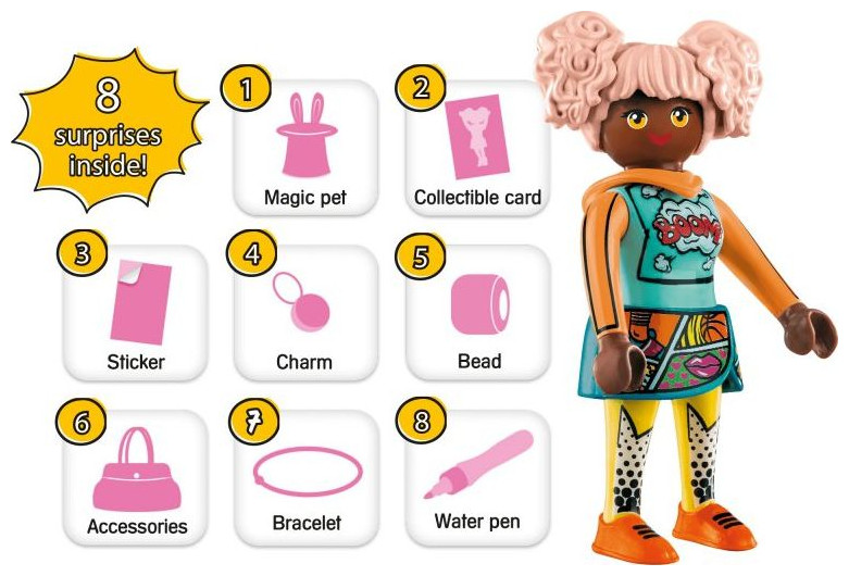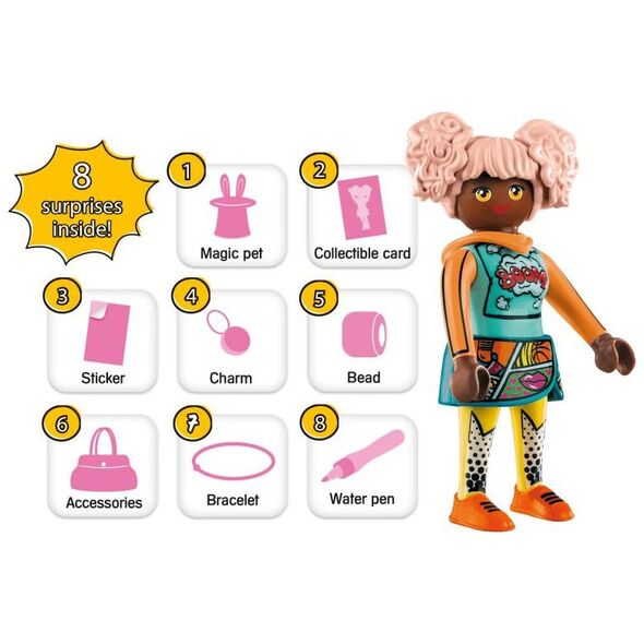 Η Edwina είναι αθλητικός άσος μεταξύ των κοριτσιών. Δεν υπάρχει άθλημα που να μην έχει δοκιμάσει ακόμα η Edwina! Το δεύτερο πάθος της είναι τα κόμικς - ακριβώς για να τη βοηθήσει να κάνει ένα διάλειμμα από τον αθλητισμό. Το σετ περιλαμβάνει βραχιόλι σιλικόνης, χάντρες κοσμήματος και γούρι αθλητικών παπουτσιών, κάρτα συναλλαγών, αυτοκόλλητα και πολλά αξεσουάρ. Τα αυτοκόλλητα που περιλαμβάνονται μπορούν να βαφτούν με τον νέο μαρκαδόρο PLAYMOBIL με βάση το νερό.
