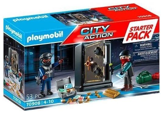 Playmobil City Action 70908 Starter Pack Safe breaking PLAYMOBIL City Action Police σετ Safe breaking. Ο κλέφτης προσπαθεί να διαρρήξει ένα καλά ασφαλισμένο χρηματοκιβώτιο Κατάφερε να σπάσει το χρηματοκιβώτιο με έναν λοστό και τώρα βάζει βιαστικά τα χρήματα σε μια βαλίτσα. Ένας αστυνομικός πιάνει στα χέρια έναν κλέφτη. Ο ληστής περνά με χειροπέδες και στη συνέχεια οδηγείται στο αστυνομικό τμήμα. Το σετ περιλαμβάνει αστυνομικό και ληστή, χρηματοκιβώτιο, ράβδους χρυσού, χρήματα, δυναμίτη, λοστό και πολλά άλλα αξεσουάρ. Το χρηματοκιβώτιο μπορεί να ανοίξει μόνο ρυθμίζοντας τον σωστό συνδυασμό αριθμών χρησιμοποιώντας τους περιστρεφόμενους δίσκους. Το χρηματοκιβώτιο μπορεί να χρησιμοποιηθεί και ως κουμπαράς. Εμπορικός δείκτης: GXP-826727 Barcode: 4008789709080 Ηλικία ή έτος: από 4 ετών{Ηλικία} Από 4 ετών. {Για ποιον} Universal . {Series} City Action. {Αριθμός στοιχείων} 1 . {Αριθμός ψηφίων} 2