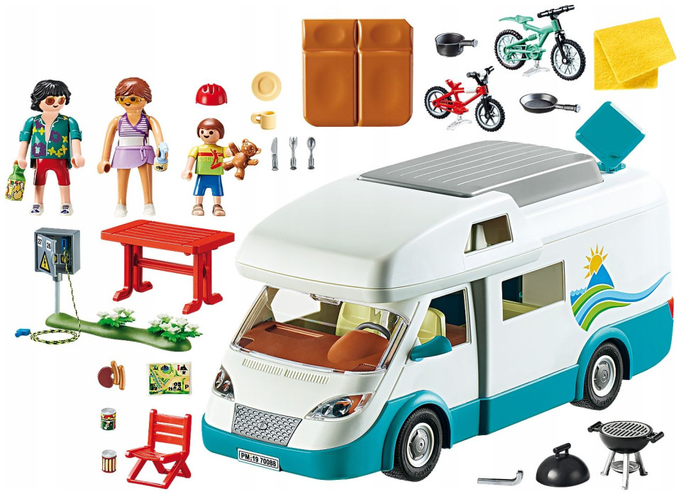 W zestawie: samochód kempingowy, 3 figurki wczasowiczów, 2 rowery, grill, stół, krzesełko, ręcznik, inne elementy widoczne na zdjęciu.
