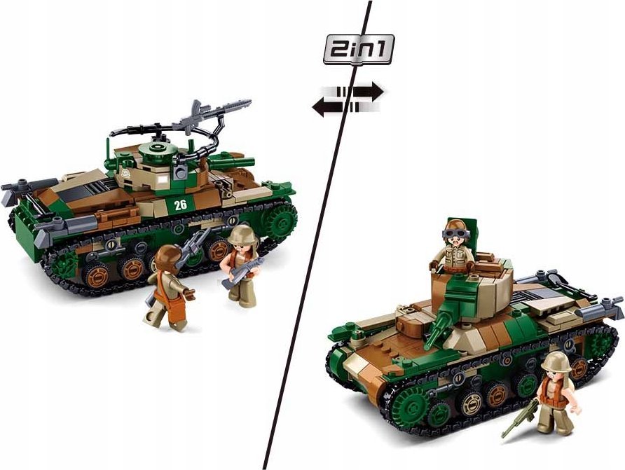 BLOKI: SLUBAN SERIA: ARMIA WWII MODEL: M38-B1107 CZOŁG 2W1 ILOŚĆ ELEMENTÓW: 563 szt. ZGODNOŚĆ Z NORMAMI UNIJNYMI: CE; EN71Sprzedawca podaje, że zdjęcia prezentujące oferowany towar mają jedynie charakter poglądowy. Rzeczywisty wygląd, zwłaszcza kolor, może różnić się od tego przedstawionego na zdjęciach.Zestaw CZOŁG 2W1 (MOŻLIWOŚĆ ZBUDOWANIA JEDNEGO LUB DRUGIEGO NA ZMIANĘ) składa się z 563 elementów w postaci bloków konstrukcyjnych i figurek, jest on kompatybilny z innymi markami klocków (LEGO; COBI; KAZI; BLOCKI; LEUI i wiele innych) Bloki SLUBAN zostały zaprojektowane z myślą o bezpieczeństwie dziecka, co zostało potwierdzone przeprowadzonymi testami i dopuszczeniem produktu do sprzedaży w Unii Europejskiej.
