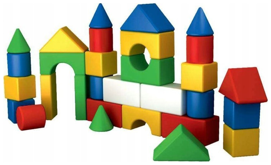 Zestaw klocków do budowania budowli. Tworzy go 28 elementów o różnych kształtach i kolorach. Dostępne kształty to: sześcian, prostopadłościan, stożek, daszek, walec, mostek. Różne typy kloców zapewniają możliwość tworzenia nietypowych scenerii i budynków. Odmienne kolory przyciągają uwagę dziecka i nadają stworzonym obiektom bajkowego wyglądu. Każdy element został wykonany z wytrzymałego tworzywa.