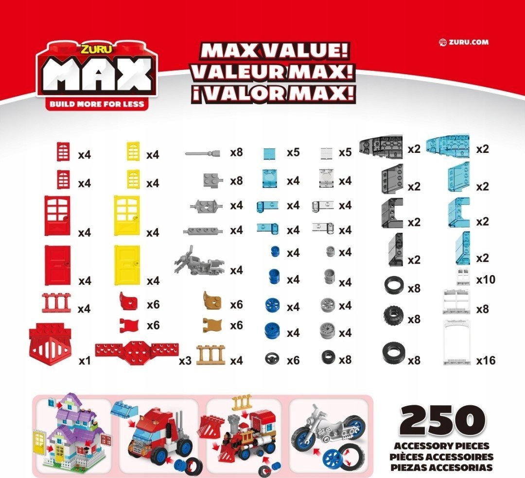 Zestaw akcesoriów 250 klocków ZURU Max Build Zestaw akcesoriów 250 klocków Producent: ZURU Max Build Numer ID:ZURU Max Build Zestaw akcesoriów 250 klocków Poczuj maksimum satysfakcji z budowania z zestawem klocków Max Build ZURU! Dzięki wysokiej jakości klockom konstrukcyjnym dla dzieci wzniesiesz się na wyżyny kreatywności i odkryjesz w sobie nowe pokłady twórczego myślenia. Zachwyć się możliwościami budowania z klocków, które dostarczają najwyższą jakość wykonania, nie naruszając ciężko portfela. Są kompatybilne z innymi klockami wiodących marek zabawek budowlanych. Zestaw 250 elementów klocków Max Build zawiera ciekawe części pozwalające uzupełnić Twoje konstrukcje o koła, drzwi oraz okna. Dzięki nim wszelkie domy oraz pojazdy nabiorą duszy, a konstrukcje staną się jeszcze ciekawsze. Klocki dla dzieci do budowania ZURU Max Build to najlepsza jakość budowania w przystępnej cenie, miłej dla portfela. Aż 250 elementów w tematyce domu i pojazdów: drzwi, okna, fragmenty dachów, osie, nadwozia czy koła. Puść wodze fantazji! Najlepsza jakość klocków konstrukcyjnych w przystępnej cenie. Poręczne pudełko - opakowanie zestawu klocków ZURU Max Build 250 może służyć również jako pojemnik do przechowywania. Zestaw Okna, koła i drzwi zachęcają do szukania kreatywnych rozwiązań i twórczego wyrażania siebie. Klocki Max Build ZURU są w pełni kompatybilne z wiodącymi markami klocków budowlanych.