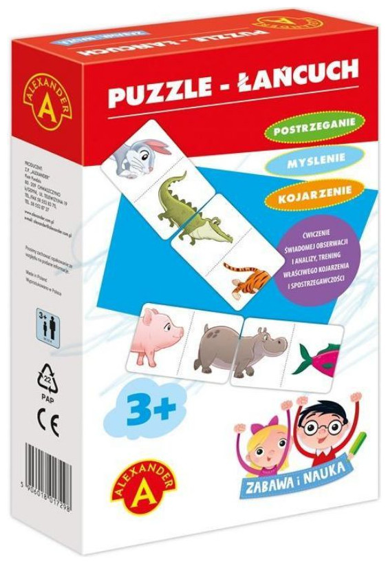Το παιχνίδι αποτελείται από 16 ταμπλέτες με τα μισά δύο διαφορετικών ζώων. Ο στόχος του παιχνιδιού είναι να σχηματίσει μια αλυσίδα ζώων που είναι διατεταγμένα σε μια σειρά από τα ξεδιπλωμένα και αναμεμειγμένα δισκία. Η τοποθέτηση πρέπει να ξεκινά με τον πίνακα με τη λέξη "Έναρξη" και να τελειώνει με τον πίνακα με τη λέξη "Τέλος". Η σειρά που δημιουργείται θα πρέπει να σχηματίζει μια αλυσίδα από πλήρεις φιγούρες ζώων.{Ηλικία} Από 3 ετών. {Αριθμός στοιχείων} 16 . {Υλικό} Χαρτόνι . Παζλ {Type}