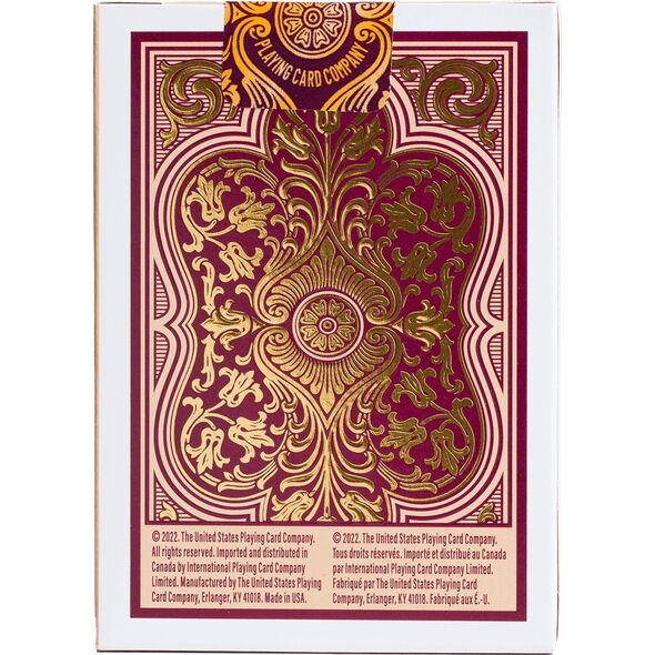 Bicycle Verbena. Liczba kart: 56 szt., Kolor produktu: Bordowy, Liczba magnetofonów: 1 płyt(y). Waga brutto palety: 633 kg, Produkty na skrzynię wysyłkową (wewnętrzną): 6 szt., Długość kartonu do wysyłki: 28,3 cm. Waga produktu: 100 g, Szerokość produktu: 65 mm, Głębokość produktu: 92 mm. Producent: U. S. Playing Card Co.