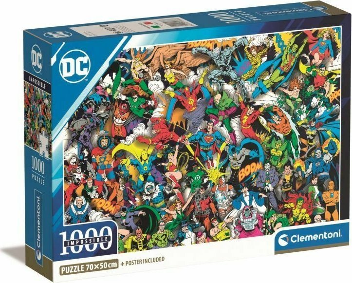 Clementoni Puzzle 1000el Compact Impossible DC Comics Justice League 39863 Clementoni Puzzle Compact składające się z 1000 elementów to prawdziwe wyzwanie dla każdego dużego i małego miłośnika układania. Układanie puzzli to rozwijająca aktywność, która wycisza oraz wymaga cierpliwości, koncentracji i wytrwałości. Uczy najmłodszych spostrzegawczości oraz rozwija ich zdolności manualne i umiejętność logicznego myślenia. Jest to również świetna forma relaksacji i odprężenia w wolnym czasie. Z każdym kolejnym puzzlem dopasowanym do układanki zaczynamy dostrzegać powstający obrazek, co sprawia ogromną satysfakcję. Po ułożeniu układanki powstanie obrazek o wymiarach 70x50cm, przedstawiający Ligę Sprawiedliwości. Dzięki dużej liczbie elementów puzzle zapewnią wiele godzin wspaniałej zabawy w układanie i będą doskonałym prezentem z okazji urodzin, Dnia Dziecka lub świąt. Wszystkie elementy układanki zostały umieszczone w solidnym, tekturowym pudełku.Kod producenta: 39863 CLEMENTONI