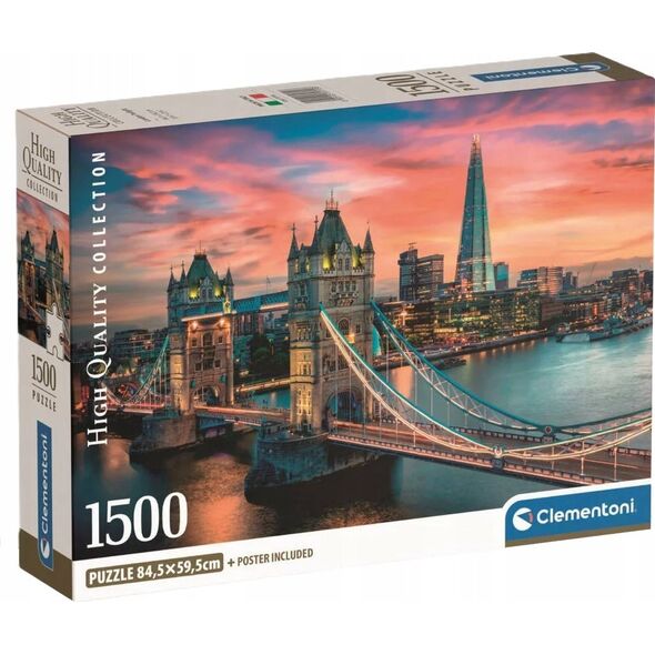 Puzzle 1500 elementów Compact Londyn o zmierzchu 31715 Clementoni Puzzle Compact składające się z 1500 elementów to prawdziwe wyzwanie dla każdego dużego i małego miłośnika układania. Układanie puzzli to rozwijająca aktywność, która wycisza oraz wymaga cierpliwości, koncentracji i wytrwałości. Uczy najmłodszych spostrzegawczości oraz rozwija ich zdolności manualne i umiejętność logicznego myślenia. Jest to również świetna forma relaksacji i odprężenia w wolnym czasie. Z każdym kolejnym puzzlem dopasowanym do układanki zaczynamy dostrzegać powstający obrazek, co sprawia ogromną satysfakcję. Po ułożeniu układanki powstanie obrazek o wymiarach 84,5x59,5cm, przedstawiający Londyn. Dzięki dużej liczbie elementów puzzle zapewnią wiele godzin wspaniałej zabawy w układanie i będą doskonałym prezentem z okazji urodzin, Dnia Dziecka lub świąt. Wszystkie elementy układanki zostały umieszczone w solidnym, tekturowym pudełku. Wymiary : 84.5 x 59 cm