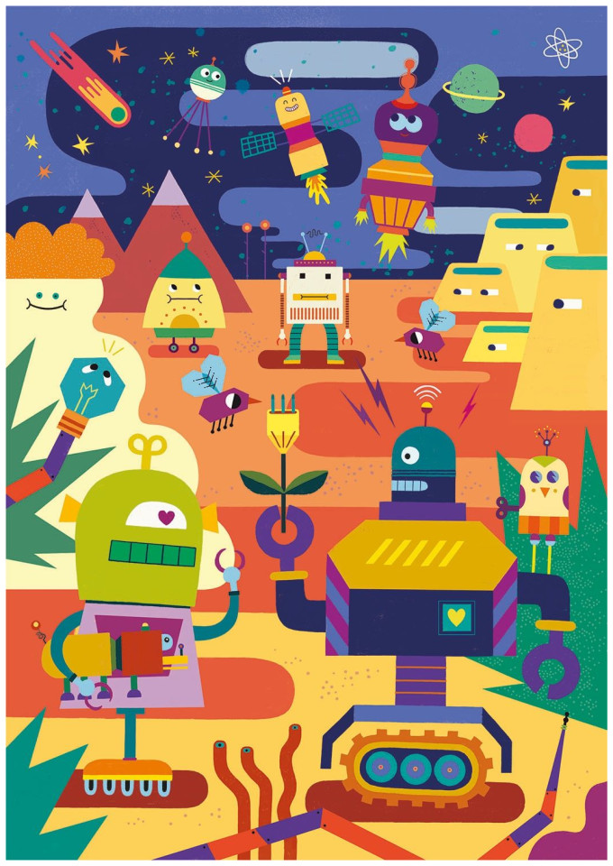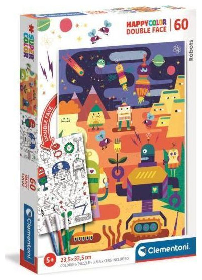 Wysokiej jakości Puzzle Happy Kolor Double Face Robot cenionej marki Clementoni, składające się z 60 elementów. Wymiary obrazka po ułożeniu 23,5x33,5 cm.