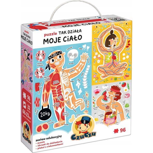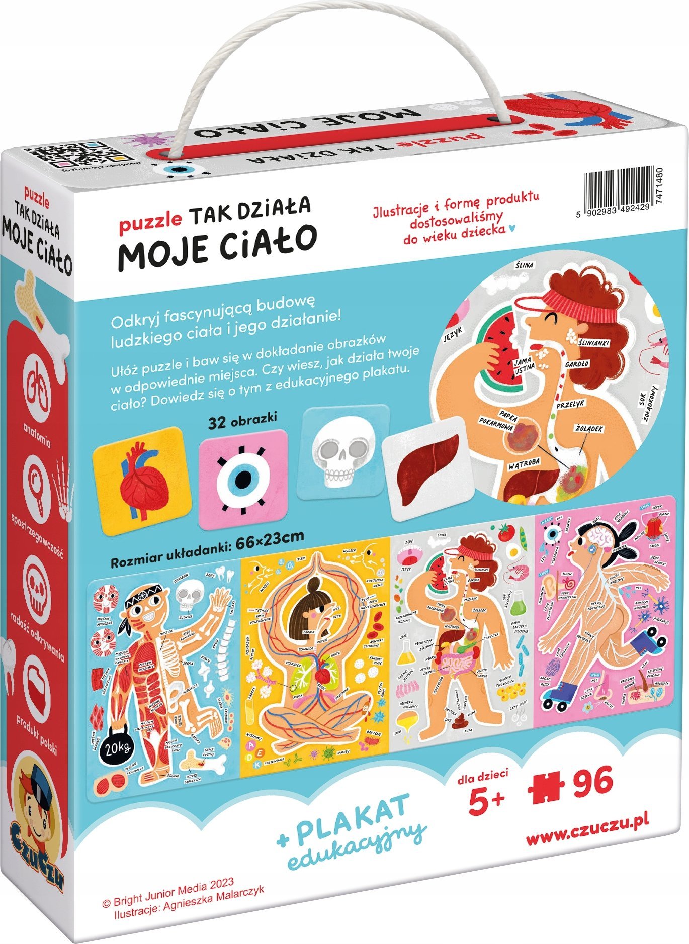 Puzzle Tak działa Moje ciało dla dzieci 5+ Odkrywamy razem fascynującą budowę i działanie ludzkiego ciała! Edukacyjny zestaw to fantastyczny pomysł na prezent dla bystrego i żądnego wiedzy starszaka i sposób na pierwszą lekcję anatomii. Duża układanka składa się aż z 96 elementów i w przyjazny sposób przedstawia schematyczną budowę przeróżnych układów ludzkiego ciała. Na dodatkowych 32 elementach znajdziecie wizerunki różnych narządów. Do zestawu dołączyliśmy plakat pełen informacji o ciele, a jeszcze więcej ciekawostek znajdziecie na naszej stronie. zestaw zawiera 96 puzzli, 32 obrazki do dokładania, plakat edukacyjny wymiar układanki: 66 x 23 cm elementy są wykonane z grubej, trwałej tektury pudełko o wymiarach 16,5 x 19 x 5 cm odpowiednie dla dzieci w wieku 5+ pomysł na prezent zabawa rozwija małą motorykę, spostrzegawczość i wyobraźnię Przepis na dobrą zabawę Bawcie się, przyjmując jednocześnie solidną dawkę wiedzy! Ułóżcie puzzle i obejrzyjcie ilustrację, rozmawiając o tym, co ona przedstawia. Nazywajcie narządy, układy, rozmawiajcie o ich działaniu - to świetny sposób na poznawanie nowego tematu i utrwalanie wiedzy. Dokładajcie elementy, trenując bystre oko i refleks, możecie zagrać na czas. Pomysłów na rozwijające zabawy z edukacyjnym zestawem jest mnóstwo – dajcie się ponieść wyobraźni! Ten zestaw to pozycja obowiązkowa i doskonały pomysł na mądry prezent dla młodych odkrywców.Radość odkrywania Przedszkolak codziennie chłonie nową wiedzę, ma więcej zainteresowań, rozumie otaczający go świat coraz lepiej. Zabawa z zestawem znakomicie rozwija spostrzegawczość i wyobraźnię. W przyjazny sposób pozwala dowiedzieć się, jak jest zbudowane i jak działa ludzkie ciało. Zabawa w dokładanie elementów to sposób na trening spostrzegawczości. Edukacyjny zestaw znakomicie sprawdzi się w domu i przedszkolu.CzuCzu jest polską marką, którą tworzymy od 2009 r. Książeczki, gry, puzzle i zabawki edukacyjne opieramy na prostych rozwiązaniach, które dają rodzicom i dzieciom przestrzeń do inicjowania własnych pomysłów na zabawę. Podążamy za dziećmi, wspierając ich rozwój motoryczny, emocjonalny i społeczny. Nasze książeczki i zabawki odznaczają się najwyższą jakością wykonania i są dopracowane w najmniejszym szczególe. CzuCzu jest w całości produkowane w Polsce. Wiemy też, że dobra zabawa nie ma górnej granicy wieku! Rośniemy razem z dziećmi, słuchamy naszych klientów i… nas samych, bo w Zespole CzuCzu jest mnóstwo puzzlomaniaków. Stąd pomysł na nową serię Puzzlove CzuCzu, w której znajdziecie duże układanki o zróżnicowanej liczbie elementów. To świetny pomysł na relaks i zabawę dla dzieci, młodzieży i dorosłych. Wiemy, czym jest radość układania.Doceniają nas nie tylko dzieci i rodzice! Z dumą i radością dajemy znać, że w 2020 roku za całokształt naszych działań edukacyjnych dostaliśmy Nagrodę Specjalną w XVIII edycji Konkursu Świat Przyjazny Dziecku organizowanego przez Komitet Ochrony Praw Dziecka.