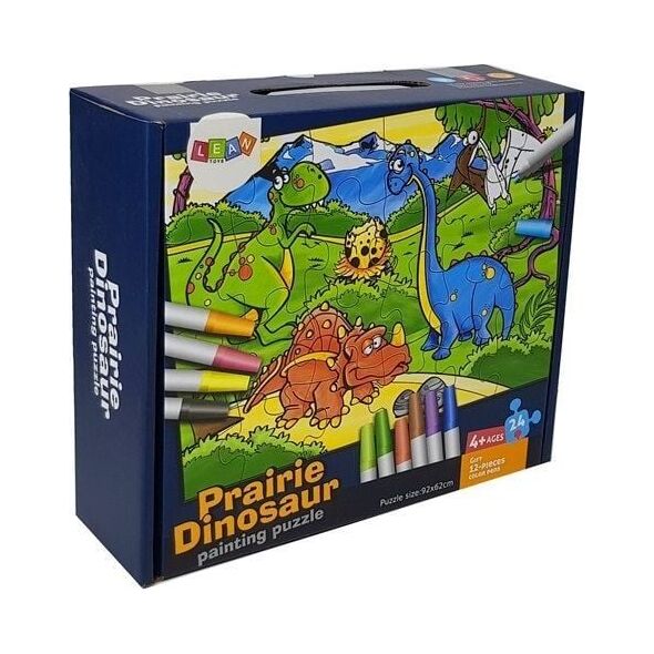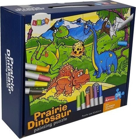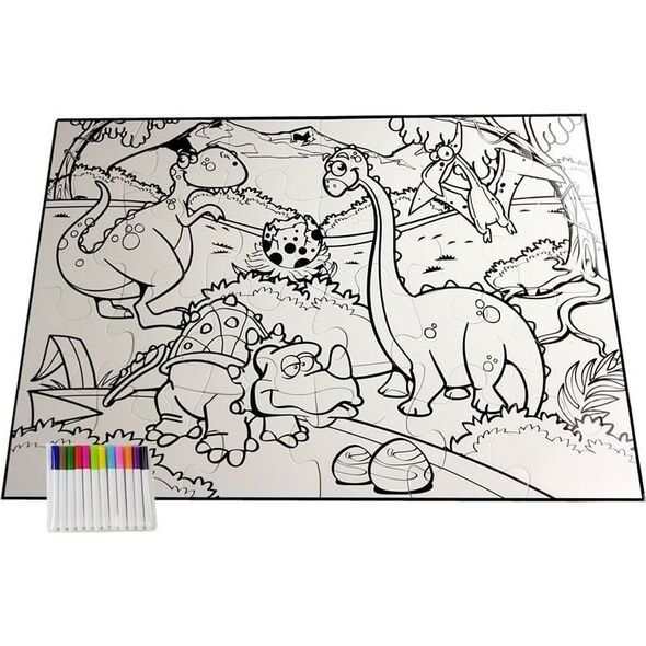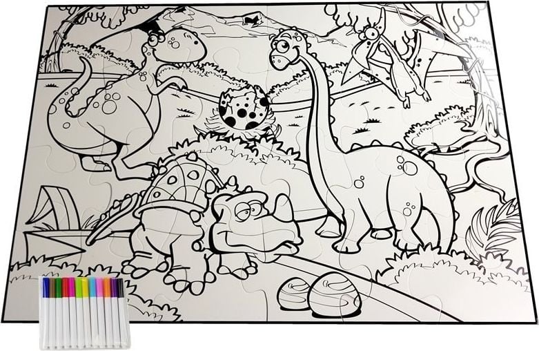 Το σετ αποτελείται από 24 παζλ και 12 διαφορετικούς χρωματικούς μαρκαδόρους με τους οποίους το παιδί μπορεί να ζωγραφίσει. Η εικόνα δείχνει τους δεινόσαυρους και το περιβάλλον στο οποίο ζούσαν. Μόνο τα μαύρα περιγράμματα σημειώνονται σε λευκό φόντο. Θα είναι σε θέση να μάθει για την εμφάνιση και το περιβάλλον αυτών των προϊστορικών ζώων. Θα διευρύνει τις γνώσεις σας και θα αναπτύξει τις χειρωνακτικές σας δεξιότητες κατά τη σύνθεση.