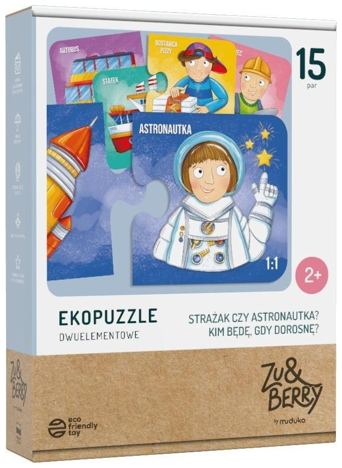Ekopuzzle dwuelementowe 15 par Strażak czy astronautka z serii Zu&Berry od Muduko powstały z myślą o dzieciach powyżej 2 roku życia. Puzzle Strażak czy astronautka?, w których łączymy w pary przedstawicieli profesji z pojazdami umożliwiającymi ich wykonywanie, są nie tylko narzędziem wspomagającym motorykę małą u dzieci. Dają też okazję do rozmowy o przyszłości, marzeniach związanych z pracą i zainteresowaniach. Do zestawu dołączone są zadania, które pozwalają ćwiczyć wiele umiejętności. Z kolei przedstawione ciekawostki poszerzają wiedzę nie tylko dziecka, ale i rodzica. W przeciwieństwie do zwykłych puzzli, seria ekopuzzli potrafi bawić jeszcze na długi czas, po samym ułożeniu obrazka.