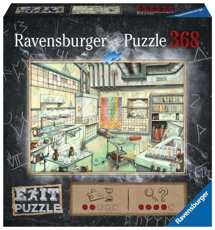 Η σειρά Puzzle Exit της Ravensburger είναι μια ιδέα παιχνιδιού δωματίου απόδρασης με τη μορφή παζλ. Μόνο αφού ολοκληρώσετε το παζλ μπορείτε να λύσετε το μοναδικό χαρακτηριστικό παζλ κάθε μοτίβου. Τακτοποιήστε 368 κομμάτια, λύστε κρυμμένους γρίφους και μάθετε τι συνέβη στο εργαστήριο. Εάν όλα τα άλλα αποτύχουν, χρησιμοποιήστε την τελική ένδειξη που παρέχεται στον σφραγισμένο φάκελο.
