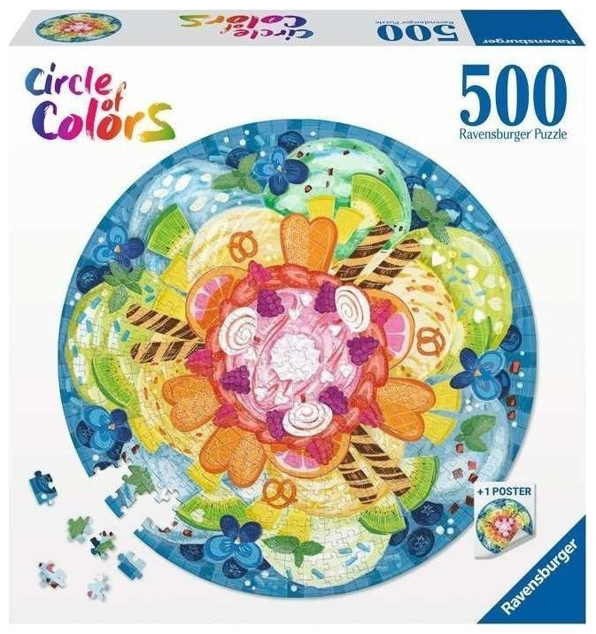 2D παζλ: Παλέτα χρωμάτων 500 στοιχείων για ενήλικες - όταν συναρμολογούνται, έχουν το σχήμα κύκλου στον οποίο περικλείεται το μοτίβο μιας πολύχρωμης εικόνας. Προορίζονται για άτομα άνω των 12 ετών Παζλ με μοτίβο παγωτού Η Ravensburger είναι ο μεγαλύτερος κατασκευαστής παζλ στον κόσμο, που τα παράγει για πάνω από 120 χρόνια. Τα παζλ Ravensburger έχουν αντιανακλαστική επίστρωση - είναι κατασκευασμένα από πατενταρισμένο, χοντρό χαρτόνι με μαλακή επένδυση (η εικόνα είναι τυπωμένη σε χαρτί με δομή λινών ινών, η οποία μειώνει την ανάκλαση του φωτός, διευκολύνει τη συναρμολόγηση και την ίδια την εικόνα , ανεξάρτητα από το μέγεθος του παζλ, είναι πιο ξεκάθαρο). Επιπλέον, χάρη στην πατενταρισμένη τεχνολογία Soft Click, κάθε μεμονωμένο κομμάτι παζλ Ravensburger έχει μοναδικό σχήμα και χωράει μόνο σε ένα μέρος. Τα σχήματα των παζλ ποικίλλουν χάρη στο χειροποίητο καλούπι. Τα παζλ Ravensburger είναι ανθεκτικά στο λύγισμα.{Αριθμός αντικειμένων} 500 . {Ηλικία} Από 12 ετών. {Αριθμός εικόνων} 1 . Στοιχεία {Theme}