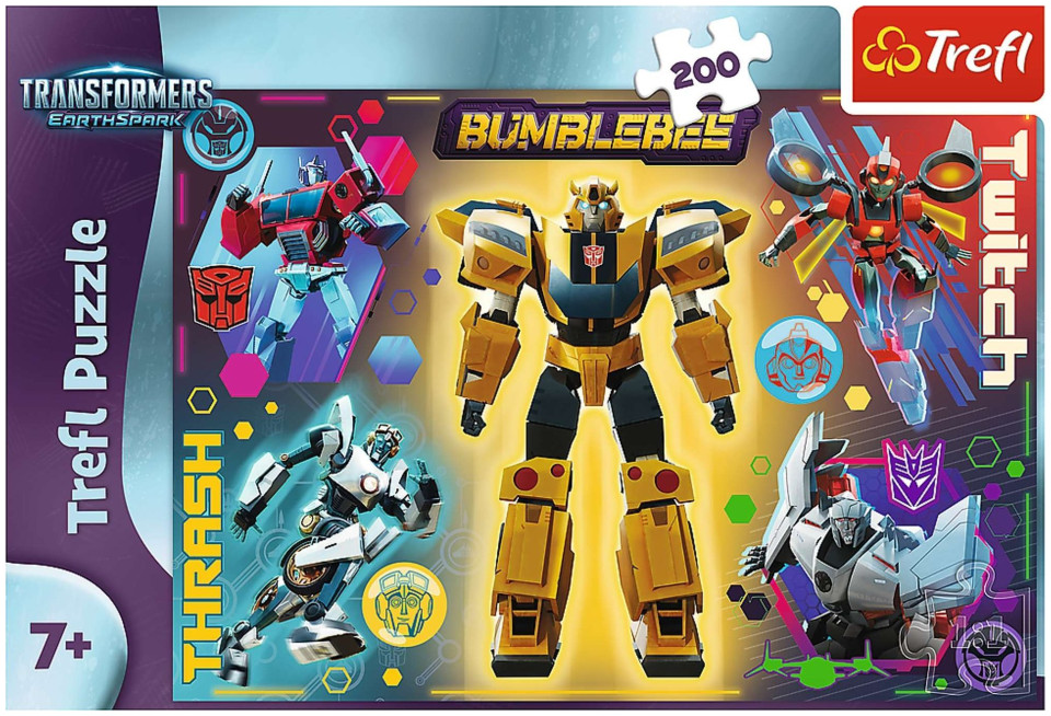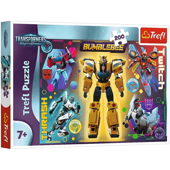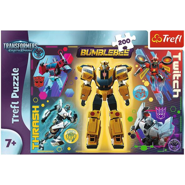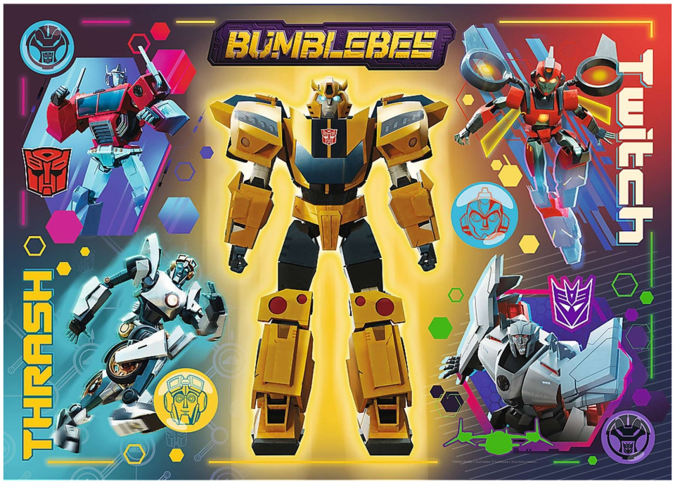 Zestaw puzzli składa się z 200 elementów i umożliwia ułożenie niezwykle barwnego obrazka przedstawiającego bohaterów Transformers, w tym: Bumblebee, Thrash i Twitch.Ułożony obrazek ma wymiary 48 x 34 cm.