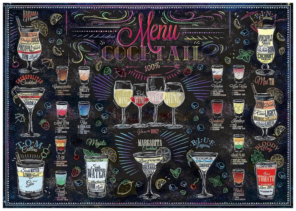 Karta drinków Puzzle składające się z 500 elementów przedstawiające kartę drinków. Po ułożeniu powstanie obrazek o wymiarach 480 x 340mm. Produkt został wykonany z wysokiej jakości materiałów, z zastosowaniem specjalnego kalandrowanego papieru odbijającego światło, co ułatwia układanie. Produkt został wyprodukowany w Polsce, a do produkcji zostały użyte materiały ekologiczne.Nr katalogowy: 37452Rodzaj: StandardLiczba elementów: 500Wymiary obrazka: 48 x 34 cmWymagania wiekowe: 10Materiał: TekturaPłeć: DziewczynkiPozostałe parametry: Wymiary opakowania: 39.6 x 26.6 x 4.4 cmKod producenta: 37452Wysokość (mm): 270Szerokość (mm): 395Głębokość (mm): 45Waga (g): 501