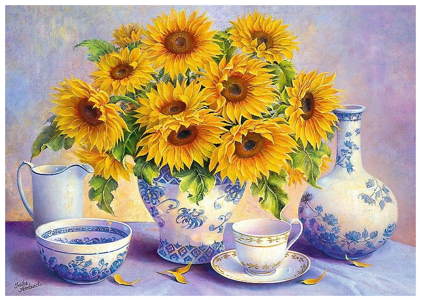 Παζλ 500 κομματιών που απεικονίζει ηλίανθους σε βάζο. Μετά την τακτοποίηση, θα δημιουργηθεί μια εικόνα με διαστάσεις 48 x 34 cm Η υψηλή ποιότητα, ο κορεσμός των χρωμάτων και η ασφαλής τακτοποίηση διασφαλίζονται από καλαντέρ, που αντανακλούν το φως, καλυμμένο με οικολογικές βαφές τροφίμων.{Ηλικία} Από 9 ετών. {Ηλικία} Από 9 ετών. {Αριθμός αντικειμένων} 500 . {Αριθμός αντικειμένων} 500 . {Αριθμός εικόνων} 1 . {Αριθμός εικόνων} 1 . {Θέμα} Φυτά . {Θέμα} Φυτά
