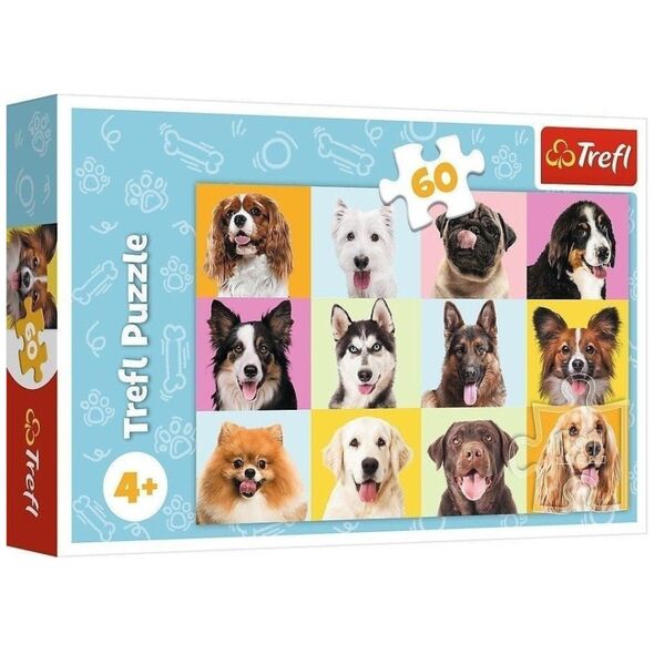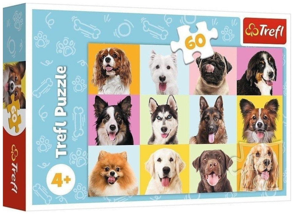 Puzzle (60 elementów) Słodkie psiaki Trefl. Układanka składa się z 60 elementów i została zaprojektowana z myślą o wszystkich małych miłośniczkach i miłośnikach puzzli. Po jej ukończeniu powstanie obrazek o wymiarach 33x22cm. Precyzyjnie wykonane i idealnie dopasowane elementy oraz wysoka jakość nadruku sprawiają, że układanie jest łatwe i przyjemne, a sam obrazek po sklejeniu specjalnym klejem do puzzli Trefl może stać się wspaniałą ozdobą dziecięcego pokoju. Układanka została zapakowana w solidne, tekturowe pudełko, które zabezpieczy elementy przed zgubieniem. Produkt wytworzono w Polsce, przy użyciu wysokiej jakości materiałów podlegających recyklingowi. Układanie puzzli, to twórcza i rozwijająca aktywność dla dziecka i całej rodziny. Wspaniała rozrywka i moc zabawy na długi czas gwarantowane. Układanki pobudzają ciekawość świata oraz wyobraźnię. Zabawa z puzzlami to również doskonały trening pamięci i koncentracji. Uczy cierpliwości i wytrwałości, a także pomaga rozwijać zdolności manualne dziecka. Ułożenie obrazka sprawia ogromną satysfakcję. Puzzle z ulubionymi bohaterami zapewnią dziecku wiele radości i będą doskonałym prezentem z okazji urodzin, Dnia Dziecka, świąt czy powrotu do szkoły.