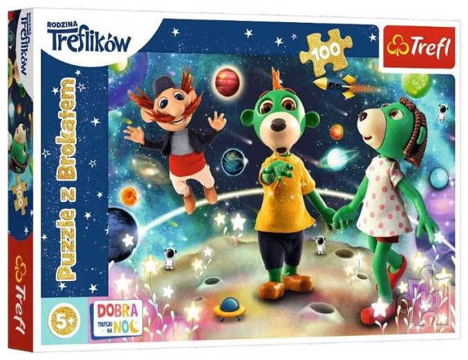 Το Trefliki ανάμεσα στα αστέρια - Καληνύχτα, το Trefliki for the night είναι ένα παζλ που αποτελείται από 100 στοιχεία, σχεδιασμένο ειδικά για τους μικρούς θαυμαστές της παραγωγής κινουμένων σχεδίων "The Treflik Family". Το παζλ καλύπτεται με λεπτή χρυσή λάμψη, που κάνει τόσο τη συσκευασία όσο και τα επιμέρους στοιχεία να αστράφτουν όμορφα και να κάνουν εκπληκτική εντύπωση. Μετά τη συναρμολόγηση του παζλ, θα δημιουργηθεί μια εικόνα με διαστάσεις 410x278 mm, που απεικονίζει τους χαρακτήρες του παραμυθιού - Treflik, Treflinka και Little Uncle.