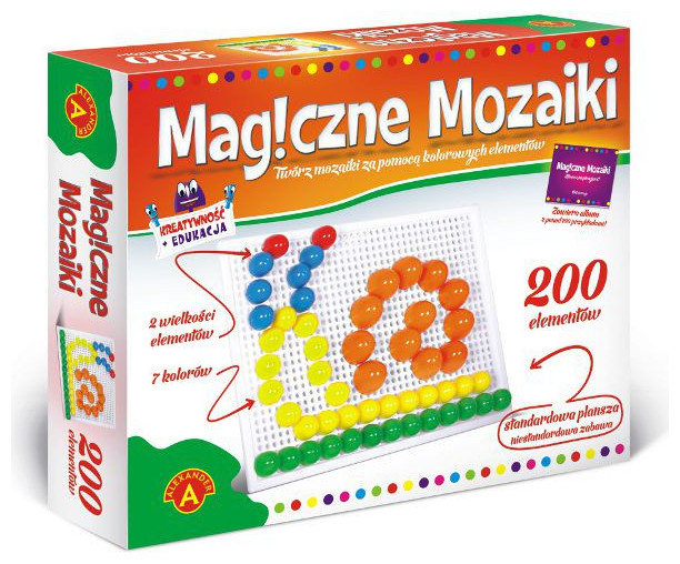 Το Magic Mosaics είναι δημιουργική διασκέδαση για παιδιά, εφήβους και ενήλικες Στη διάθεσή σας υπάρχει ένας πίνακας με πολλές τρύπες στον οποίο μπορείτε να τοποθετήσετε πολύχρωμα στοιχεία διαφόρων μεγεθών για να δημιουργήσετε διάφορα μοτίβα και εικόνες. Υπάρχουν σχεδόν άπειροι συνδυασμοί και αφού ολοκληρώσετε την εικονογράφηση, το μόνο που χρειάζεται να κάνετε είναι να βγάλετε τα στοιχεία και να ξεκινήσετε από την αρχή περιέχει 200 μανταλάκια με διάμετρο 23 mm 140 τμχ, 30 mm 60 τεμ.