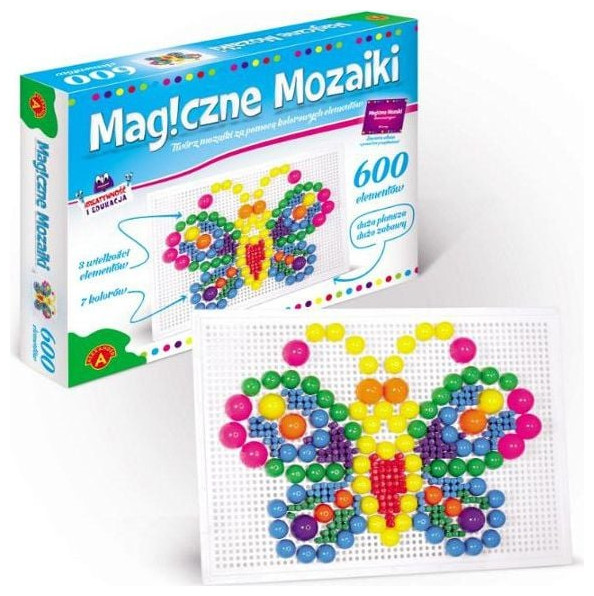 Τα στοιχεία Magic Mosaics 600 είναι δημιουργική διασκέδαση για παιδιά. Υπάρχει ένας πίνακας με πολλές τρύπες στις οποίες μπορείτε να τοποθετήσετε πολύχρωμα στοιχεία διαφόρων μεγεθών για να δημιουργήσετε διάφορα σχέδια και εικόνες. Υπάρχουν σχεδόν ατελείωτοι συνδυασμοί και μόλις ολοκληρώσετε την εικονογράφηση σας, το μόνο που έχετε να κάνετε είναι να βγάλετε τα κομμάτια και να ξεκινήσετε από την αρχή. Το σετ περιλαμβάνει ένα άλμπουμ με πάνω από 100 εμπνεύσεις. Το παιχνίδι ασκεί τη δημιουργικότητα και τη φαντασία.
