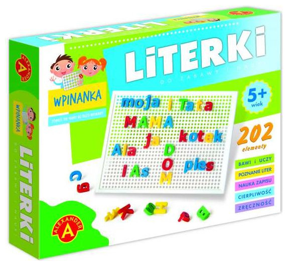 Wpinanka. Literki Seria zabawek edukacyjnych, które w przystępny i zabawowy sposób wprowadzą najmłodszych w świat liter oraz cyfr, ich zapisu oraz cierpliwości i zręczności. wiek 5+, liczba elementów 202