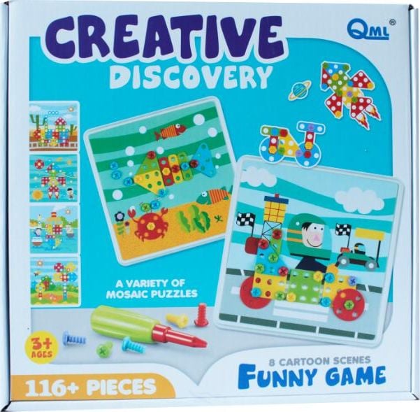 Το σετ περιέχει έως και 180 στοιχεία: βίδες σε 5 χρώματα, ένα κατσαβίδι και ροδέλες σε 4 διαφορετικά σχήματα και μεγέθη, 8 εικόνες Διαστάσεις συσκευασίας: 25,5x8x25,5cm.