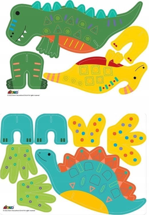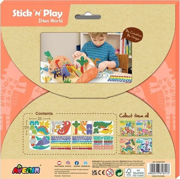 Avenir CH221841 Stick N Play Dino World Book for Kids | Dinosaur Shaped Car Opis: Product Description Each kit contains cute illustrated Dino shaped cards and resuable stickers for kids to create unique designs and play scene. Safety Warning Not suitable for children under 3 years due to small parts Data premiery: Marka: Waga: 0.441 gram Wysokość: 0.4 cm Szerokość: 9.1 cm Długość: 9.1 cmIdeal for kids to create unique designs and play scenes Contains 5 sheets of pre-cut colouring card board & 3 sheets reusable stickers Ideal for indoor play, holidays, travel, rainy day activities & quiet play Suitable for children ages 3+ Each kit contains cute illustrated dinosaur shaped cards and resuable stickers