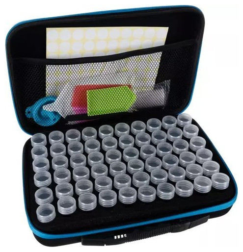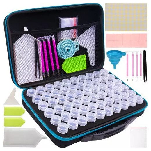 ΠΡΑΚΤΙΚΗ ΘΗΚΗ ΜΕ ΛΑΒΗ - τα αξεσουάρ για κέντημα με διαμάντια είναι ένας πολύ καλός τρόπος για να διατηρείτε τα πράγματα τακτοποιημένα ενώ παίζετε με το κέντημα. Όλα ήταν συσκευασμένα σε μια σκληρή θήκη σαν βαλίτσα. Τα βάζα για τα διαμάντια τοποθετούνται σε ειδικό καλούπι και υπάρχει μια τσέπη για τα υπόλοιπα αξεσουάρ. Επιπλέον, η θήκη διαθέτει άνετη λαβή που διευκολύνει τη μεταφορά του σετ.