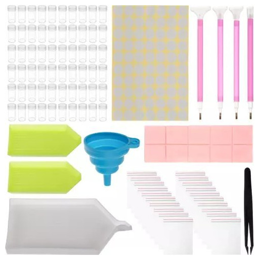 ΠΟΛΛΑ ΣΤΟΙΧΕΙΑ ΣΤΟ ΣΕΤ - το σετ κεντήματος με διαμάντια περιλαμβάνει πολλά στοιχεία που θα κάνουν το κόλλημα διαμαντιών εικόνων πολύ πιο βολικό και πρακτικό. Το σετ περιλαμβάνει αξεσουάρ όπως: θήκη, 60 βάζα, 10 τετράγωνα κόλλα, 3 κυβέτες διαφορετικών μεγεθών, πτυσσόμενο χωνί σιλικόνης, 4 στυλό διαφορετικών μεγεθών, τσιμπιδάκια, σακούλες με κορδόνια, 1 σπάτουλα για το ίσιωμα των γραμμών.