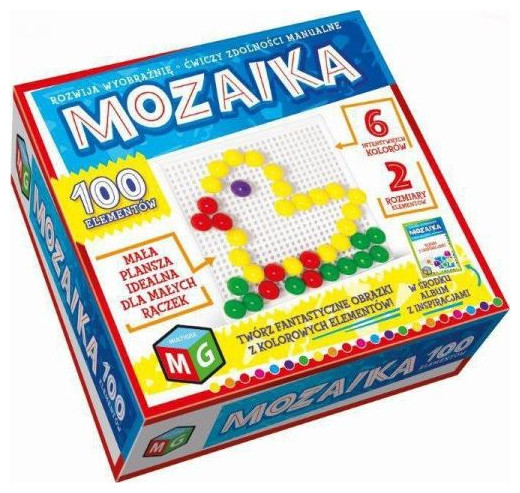 Το Mosaic είναι ένα δημιουργικό εκπαιδευτικό σετ τόσο για παιδιά όσο και για ενήλικες. Το σετ περιλαμβάνει μια μικρή σανίδα διαστάσεων 13,2 cm x 14,3 cm για την τακτοποίηση μοτίβων και 100 στοιχεία σε δύο μεγέθη. Το παιχνίδι διεγείρει τη δημιουργικότητα και αναπτύσσει τη φαντασία. Βελτιώνει τις λεπτές κινητικές δεξιότητες στα παιδιά και βοηθά τα μεγαλύτερα παιδιά να ανακαλύψουν ξανά τη χαρά του παιχνιδιού. Το σετ περιλαμβάνει ένα άλμπουμ έμπνευσης. Μπορείτε επίσης να διεγείρετε τη φαντασία σας και να δημιουργήσετε τα δικά σας μοτίβα. Μόλις ολοκληρώσετε το σχέδιό σας, απλώς βγάλτε τα κομμάτια και ξεκινήστε από την αρχή. Περιεχόμενα κουτιού: σανίδα με διαστάσεις: 13,2 cm x 14,3 cm - 1 τμχ, μεσαία στοιχεία 23 mm - 80 τμχ, μεγάλα στοιχεία 30 mm - 20 τμχ, άλμπουμ με εμπνεύσεις.{Ηλικία} Από 3 ετών. {Type}Μωσαϊκό κουμπιών
