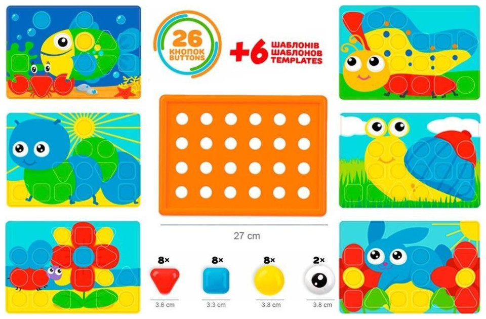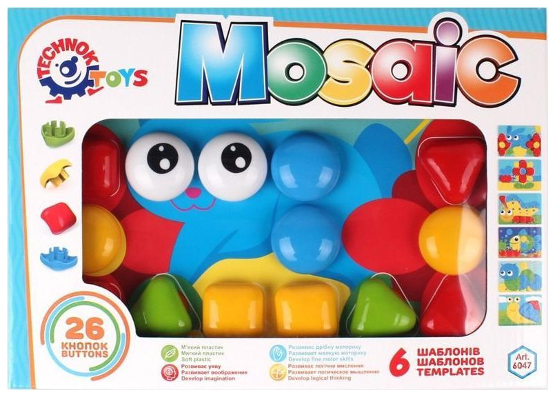 Mosaic Puzzle Blocks Patterns 6047 Ένα πολύχρωμο μωσαϊκό είναι κάτι που σίγουρα θα λατρέψουν οι νεότεροι Θα γίνει ένα αναντικατάστατο παιχνίδι μεταξύ αγαπημένων και υπεύθυνων γονιών γιατί συνδυάζει πολλά ενδιαφέροντα και χρήσιμα πράγματα. Τα παιδιά θα λατρέψουν αυτό το παιχνίδι για την ποικιλία χρωμάτων και τα ενδιαφέροντα στοιχεία παιχνιδιού, θα αναπτύξει τη φαντασία και τη φαντασία τους. Οι ενήλικες θα παρατηρήσουν το εκπαιδευτικό και αναπτυξιακό αποτέλεσμα μετά το παιχνίδι Το μωσαϊκό αποτελείται από 36 στοιχεία: 26 κουμπιά και 6 ειδικά πρότυπα. Τα κουμπιά δεν είναι μόνο πολύχρωμα, έχουν και διαφορετικά σχήματα και δύο από αυτά έχουν μάτια. Επομένως, αφού ένα παιδί κάνει ένα μωσαϊκό, τα ζώα στις φωτογραφίες "ζωντανεύουν" Μπορείτε να αποθηκεύσετε όλα τα μωσαϊκά στοιχεία σε μια βολική βαλίτσα Το παιχνίδι προορίζεται για παιδιά από 2 ετών καθιστώντας το απόλυτα ασφαλές για παιδιά Το σετ περιλαμβάνει:- 26 σχήματα - 6 ειδικά πολύχρωμα πρότυπα Διαστάσεις παιχνιδιού: 28,7 x 20,4 x 4,8 cm Διαστάσεις συσκευασίας: 35 cm x 25 cm. x 10 cm Βάρος: 0,5 kg Πληροφορίες προϊόντος