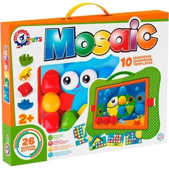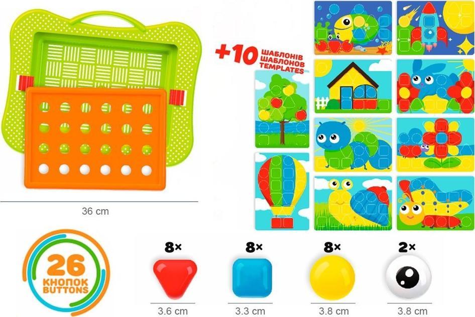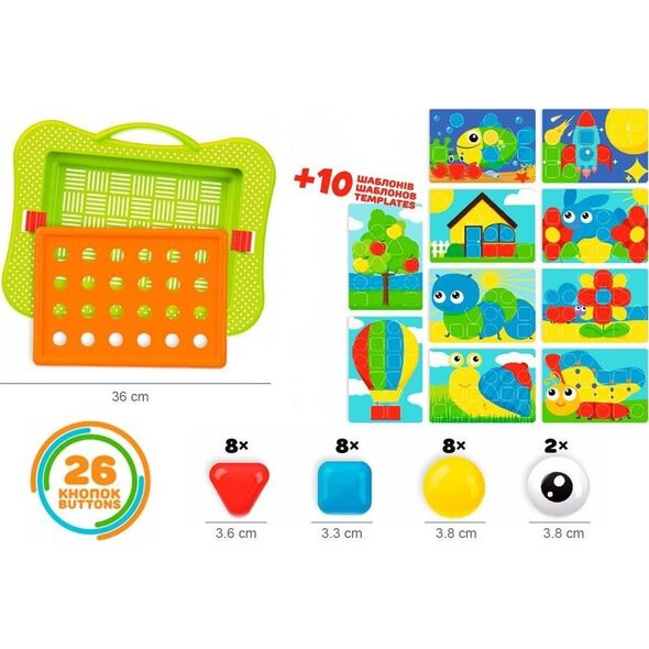 Mazika Puzzle Blocks Patterns Ένα πολύχρωμο μωσαϊκό είναι κάτι που σίγουρα θα λατρέψουν οι νεότεροι Θα γίνει ένα αναντικατάστατο παιχνίδι μεταξύ αγαπημένων και υπεύθυνων γονιών γιατί συνδυάζει πολλά ενδιαφέροντα και χρήσιμα πράγματα. Τα παιδιά θα λατρέψουν αυτό το παιχνίδι για την ποικιλία χρωμάτων και τα ενδιαφέροντα στοιχεία παιχνιδιού, θα αναπτύξει τη φαντασία και τη φαντασία τους. Οι ενήλικες θα παρατηρήσουν το εκπαιδευτικό και αναπτυξιακό αποτέλεσμα μετά το παιχνίδι. Το μωσαϊκό αποτελείται από 36 στοιχεία: 26 κουμπιά και 10 ειδικά πρότυπα. Τα κουμπιά δεν είναι μόνο πολύχρωμα, έχουν και διαφορετικά σχήματα και δύο από αυτά έχουν μάτια. Επομένως, αφού ένα παιδί κάνει ένα μωσαϊκό, τα ζώα στις φωτογραφίες "ζωντανεύουν" Μπορείτε να αποθηκεύσετε όλα τα μωσαϊκά στοιχεία σε μια βολική βαλίτσα Το παιχνίδι προορίζεται για παιδιά από 2 ετών καθιστώντας το απόλυτα ασφαλές για παιδιά Το σετ περιλαμβάνει:- 26 σχήματα - 10 ειδικά πολύχρωμα πρότυπα Διαστάσεις παιχνιδιού: 37,5 x 29 x 5 cm Διαστάσεις συσκευασίας: 40 cm x 35 cm x 8. cmΒάρος: 0,5 Πληροφορίες προϊόντος