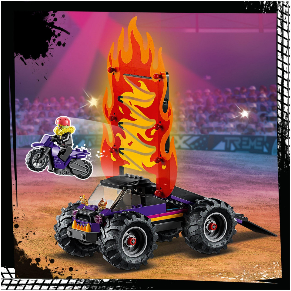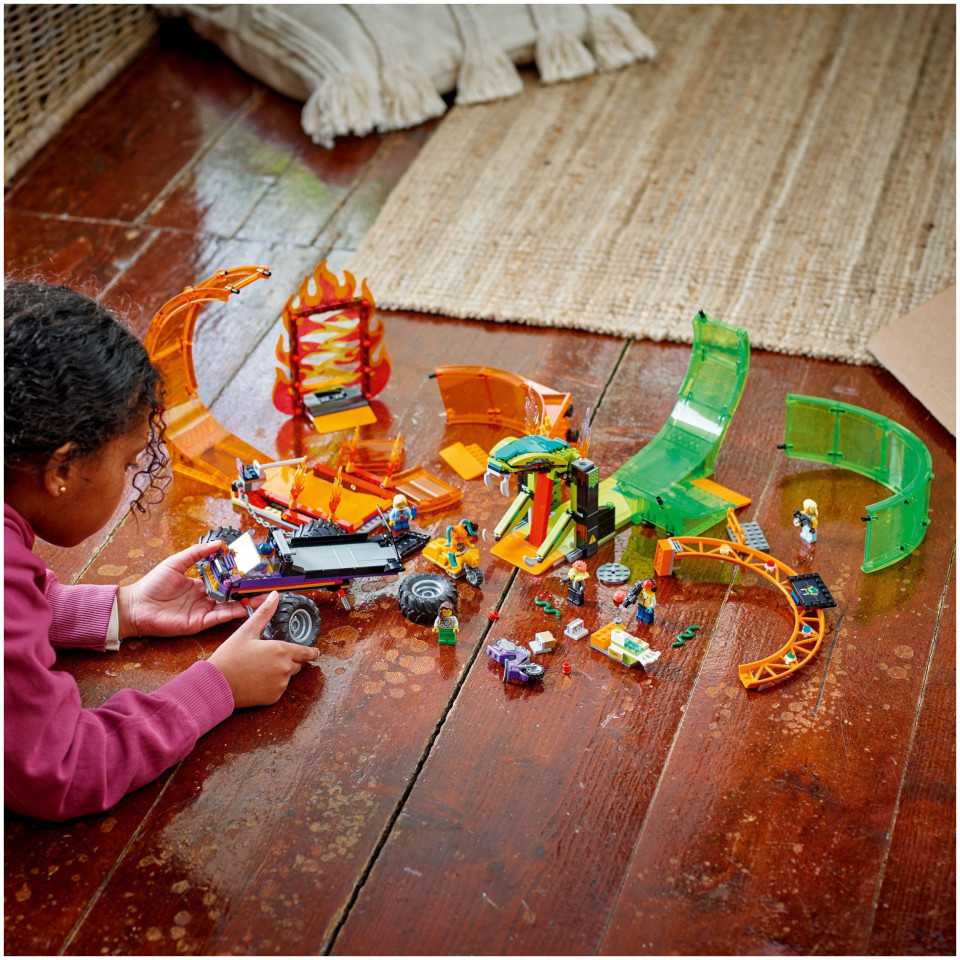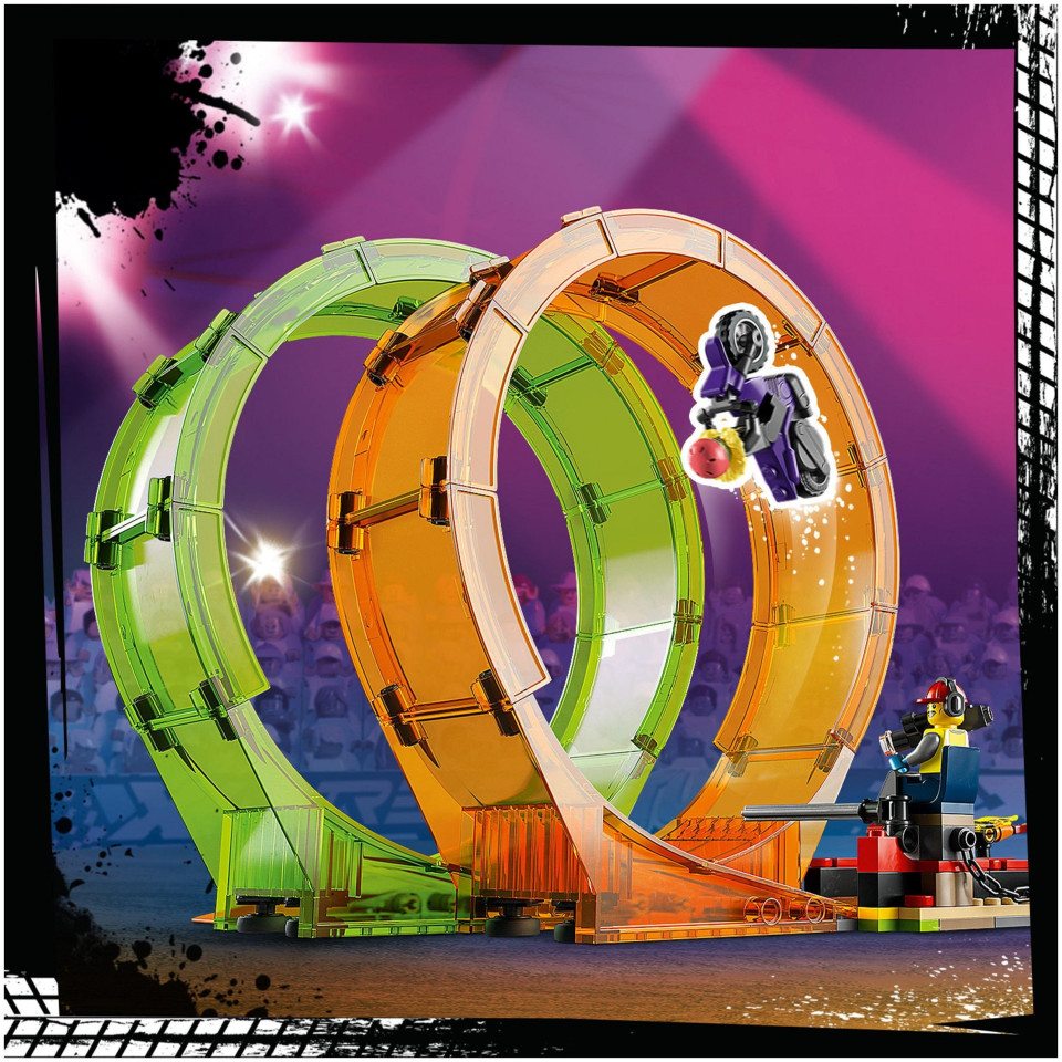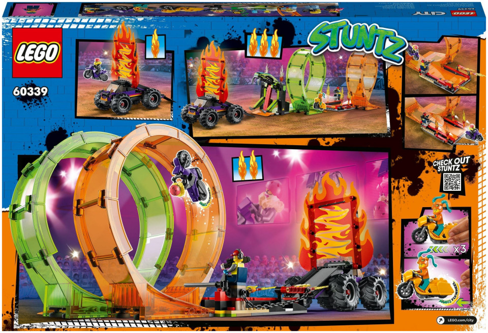 Το σετ LEGO® City Double Loop Stunt Arena (60339) είναι γεμάτο με εντυπωσιακά χαρακτηριστικά, όπως δύο μοτοσυκλέτες με σφόνδυλο και ένα φορτηγό τέρας με ράμπα για ρεαλιστικά ακροβατικά. Υπάρχουν επίσης άλλα στηρίγματα στην αρένα, όπως ένας τοίχος με φλόγα παιχνιδιού, μια θηλιά με σαγόνια φιδιού που κουμπώνουν και μια φλογερή θηλιά. Απλώς προσθέστε πολλά ωραία αξεσουάρ και επτά μίνι φιγούρες, συμπεριλαμβανομένων δύο κασκαντέρ, και είστε έτοιμοι για μια συναρπαστική παράσταση.