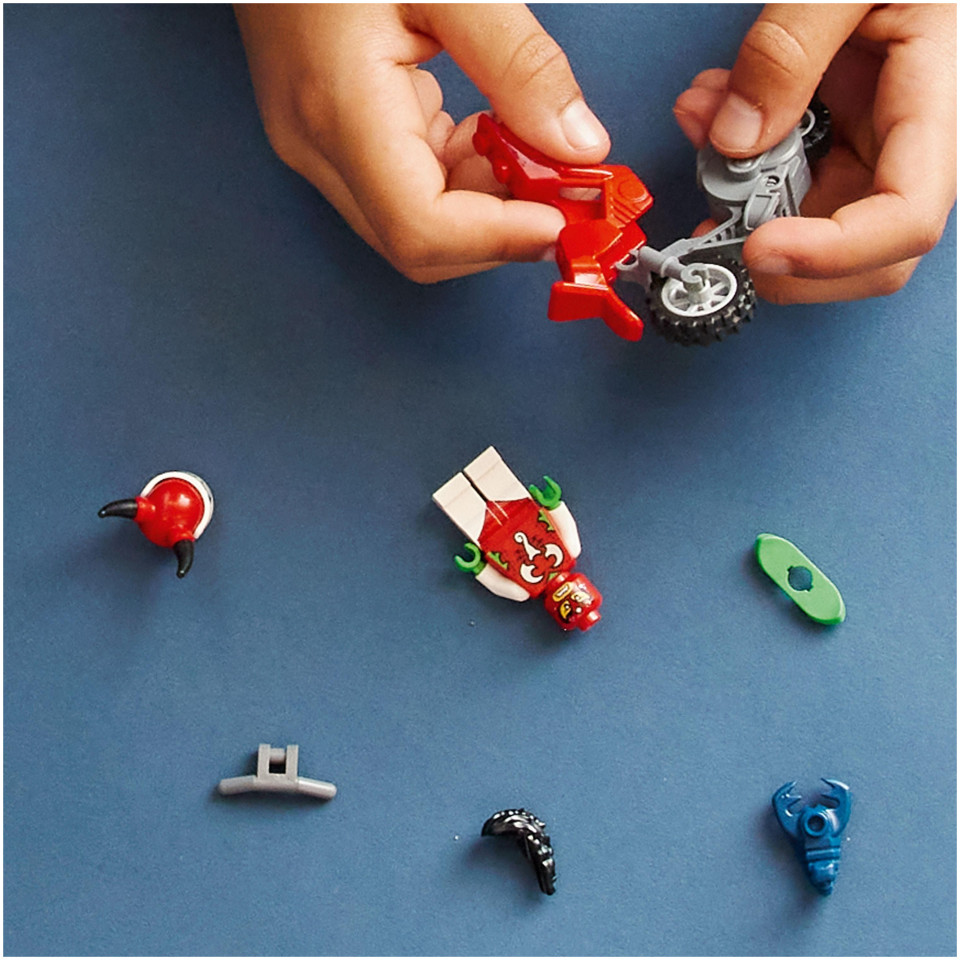 Τι υπάρχει μέσα - περιλαμβάνει όλα όσα χρειάζονται τα παιδιά για να φτιάξουν ένα ποδήλατο κόλπο με βολάν, καθώς και μια μίνι φιγούρα LEGO® City Stuntz Scorpion Luchadora και μια φιγούρα σκορπιού