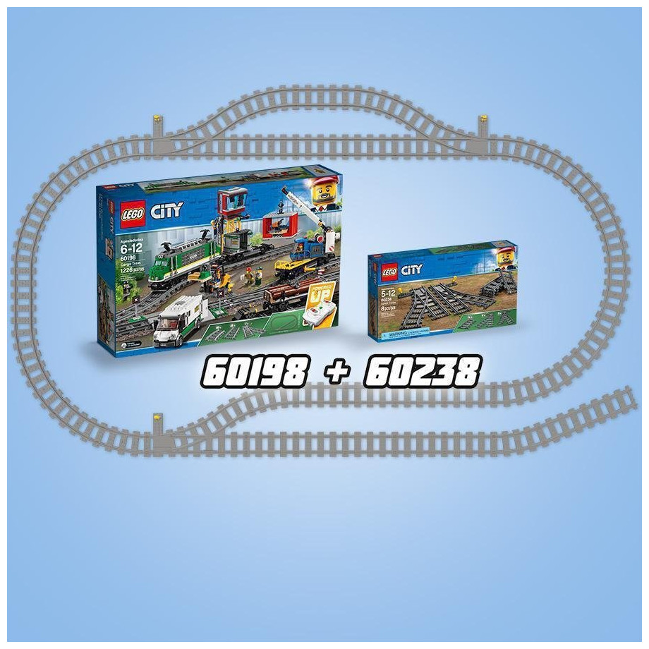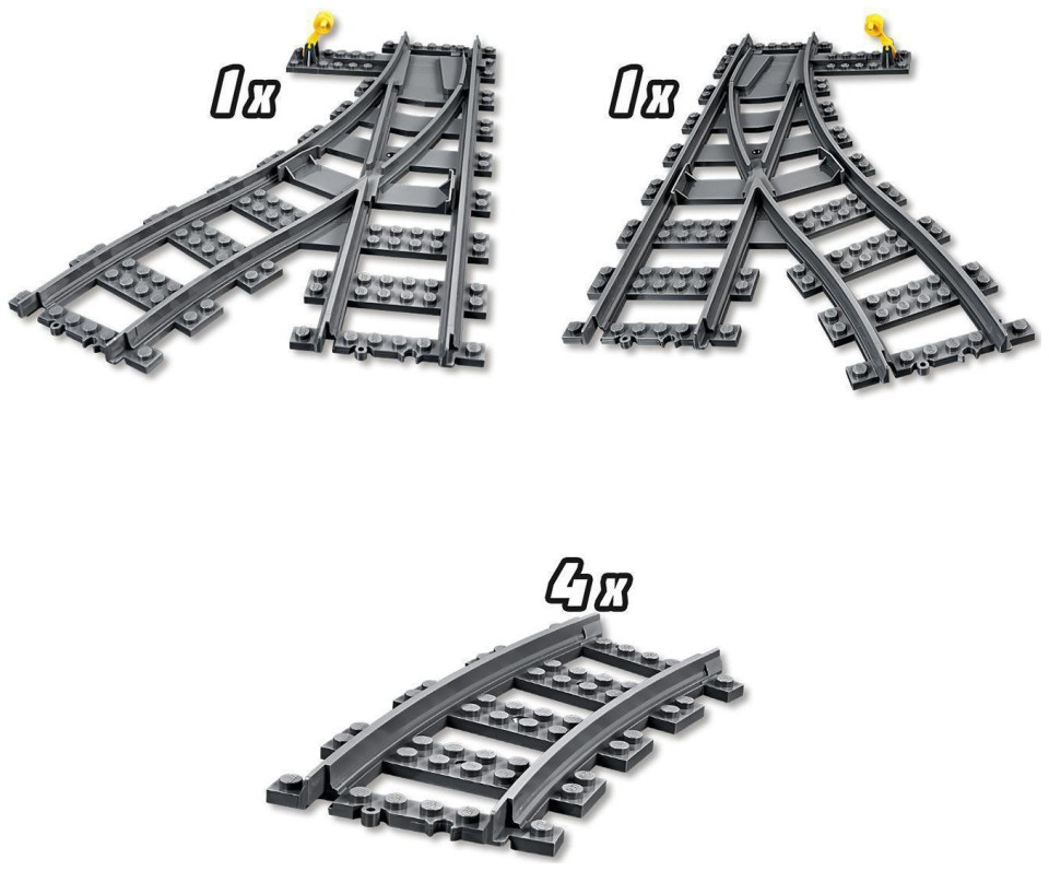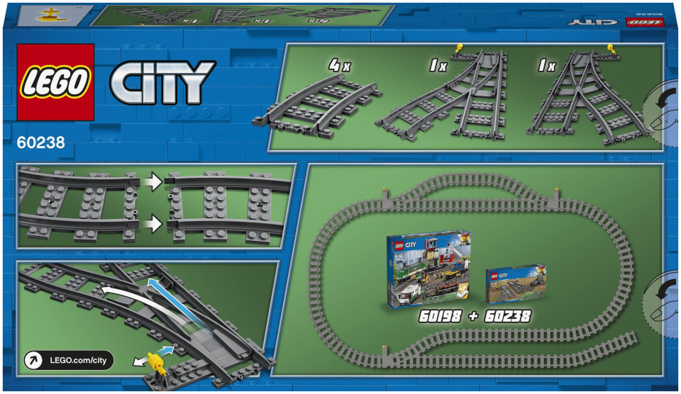 Κατασκευάστε νέες γραμμές για εμπορευματικά τρένα με το σετ LEGO® City 60238 Switches. Τώρα η μεταφορά επιβατών και φορτίου θα είναι ακόμα πιο ενδιαφέρουσα! Το σετ αποτελείται από τέσσερα τοξωτά θραύσματα τροχιάς, έναν διακόπτη που δείχνει προς τα δεξιά και έναν διακόπτη προς τα αριστερά. Οι γραμμές ταιριάζουν στα υπάρχοντα σύνολα σιδηροδρόμων.