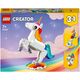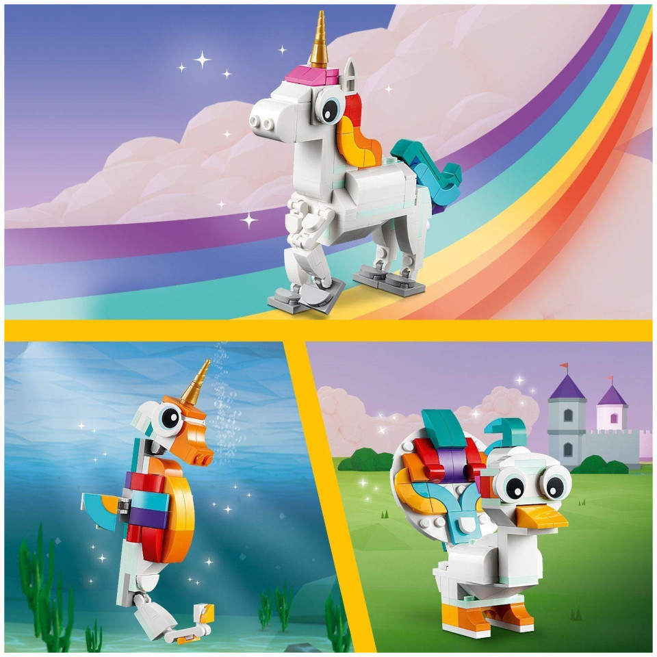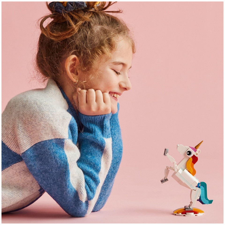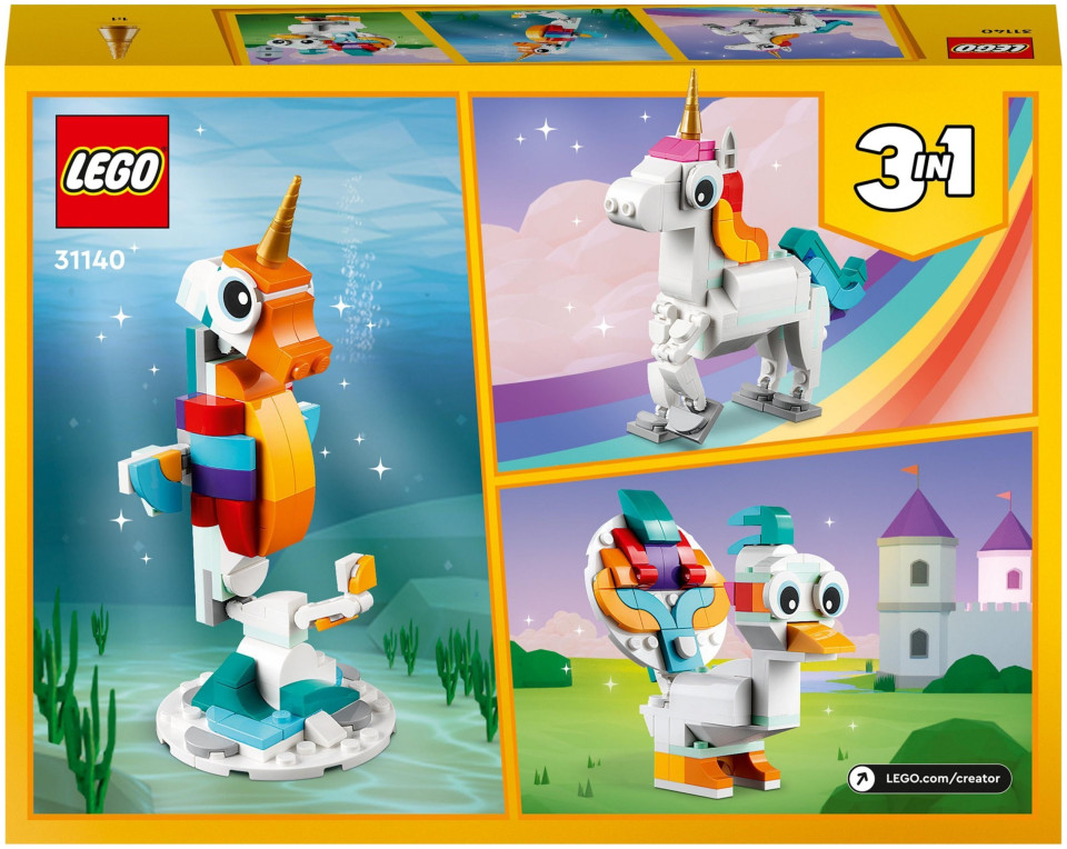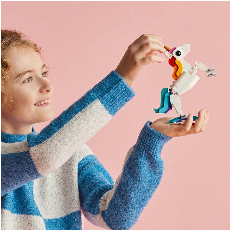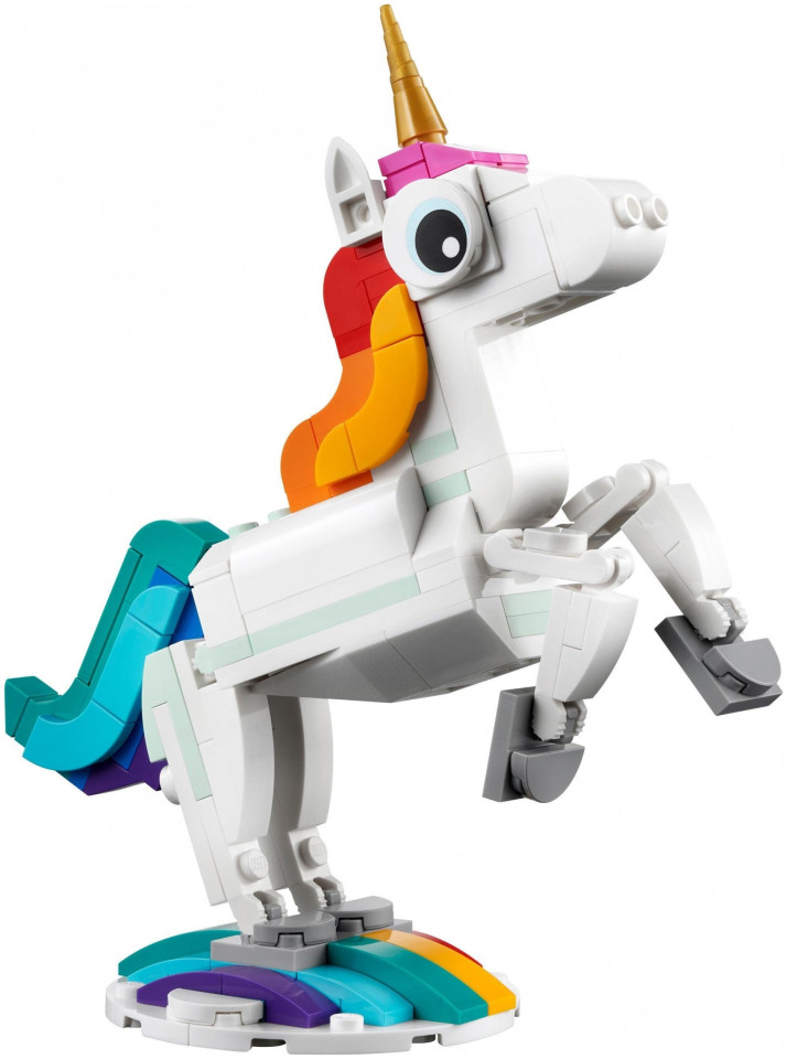 Dzięki temu zestawowi konstrukcyjnemu 3 w 1 Magiczny jednorożec (31140) kreatywne dzieci w wieku od siedmiu lat mogą przenieść się do mitycznej krainy, gdzie będą odgrywać emocjonujące historie. Zestaw zawiera jednorożca ze złotym rogiem, kolorowym ogonem oraz ruchomymi nogami i kopytami. Można go prezentować w dwóch różnych pozycjach: może stać na czterech nogach lub na dwóch tylnych nogach, aby uzyskać kultową pozę na tęczowej podstawce.