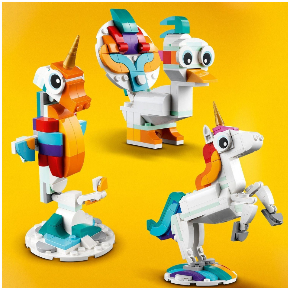 Zbuduj kolorowe zwierzęta z klocków LEGO®Dzięki trzem różnym magicznym stworzeniom, które mali konstruktorzy mogą złożyć w ramach zabawy tym zestawem LEGO Creator 3 w 1, mityczne przygody nigdy się nie kończą. Dzieci mogą zbudować ruchomego magicznego jednorożca, przerobić go na konika morskiego na podstawce imitującej dno morskie lub zamienić go w ruchomego magicznego pawia z kolorowym ogonem, a nawet użyć klocków do stworzenia zupełnie innego uroczego stworzenia.