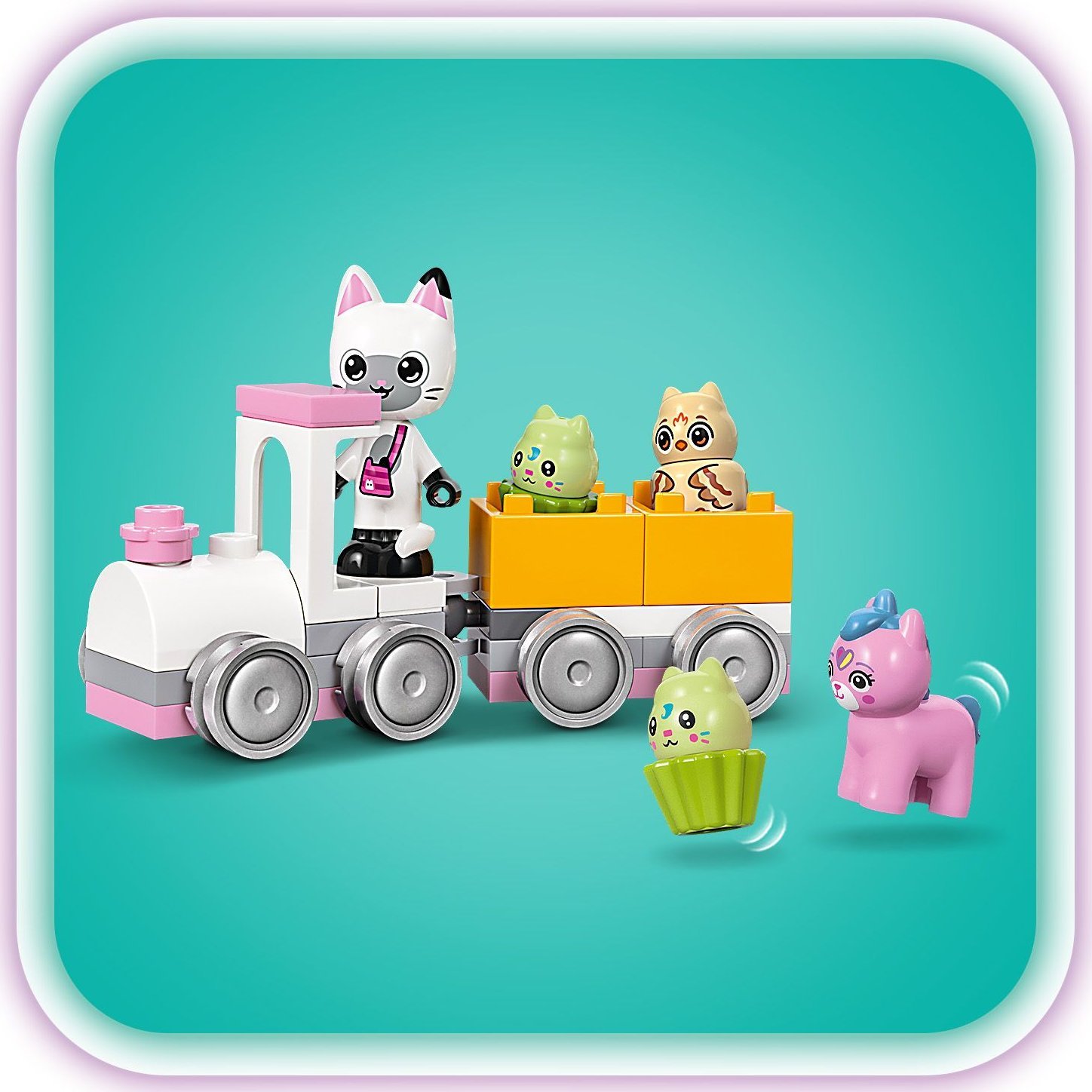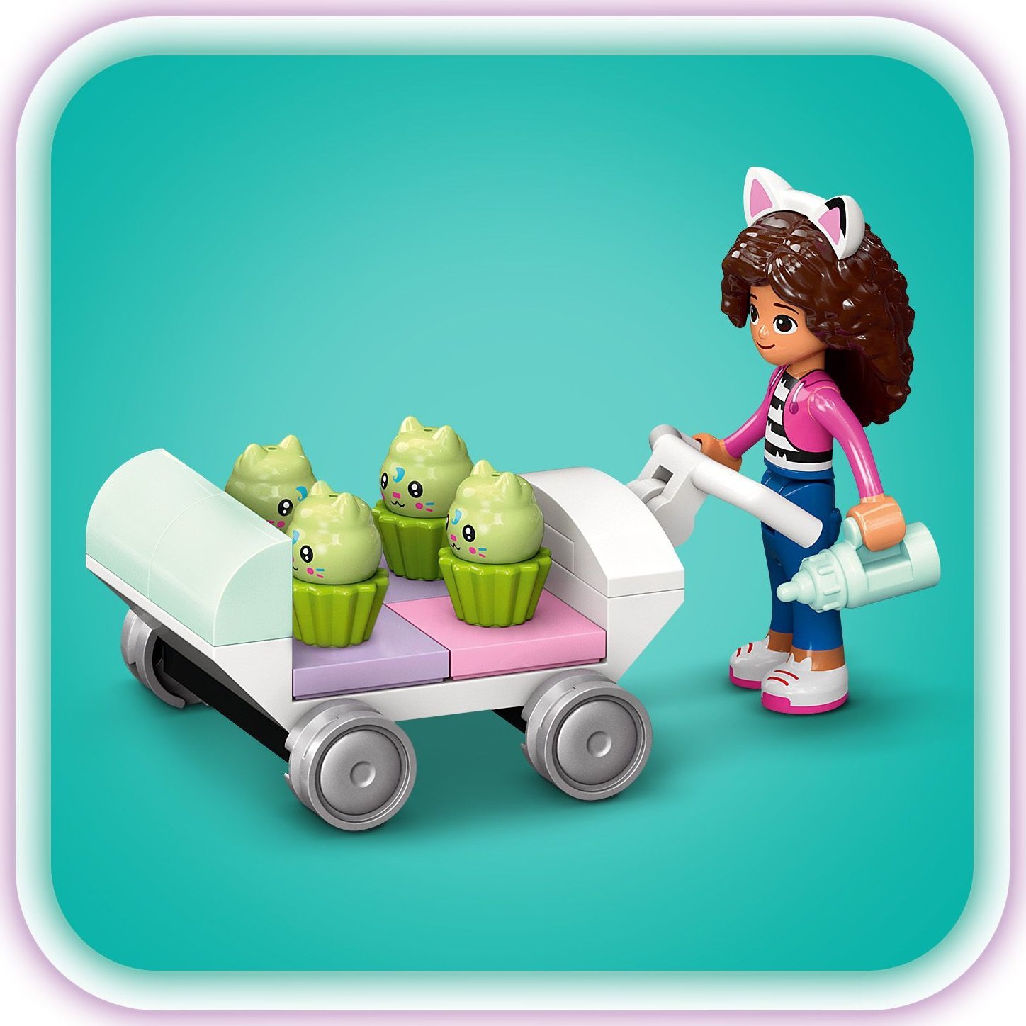 Figurki zwierząt LEGO® — w zestawie jest minilaleczka Gabby i figurki Kiciusia Pandusia, Dzidziusia Kicirożusia, Miau-Sówki i czterech Dzidzi Mafińciów, a także większy klocek startowy, dzięki któremu można szybko rozpocząć budowanie i zabawę