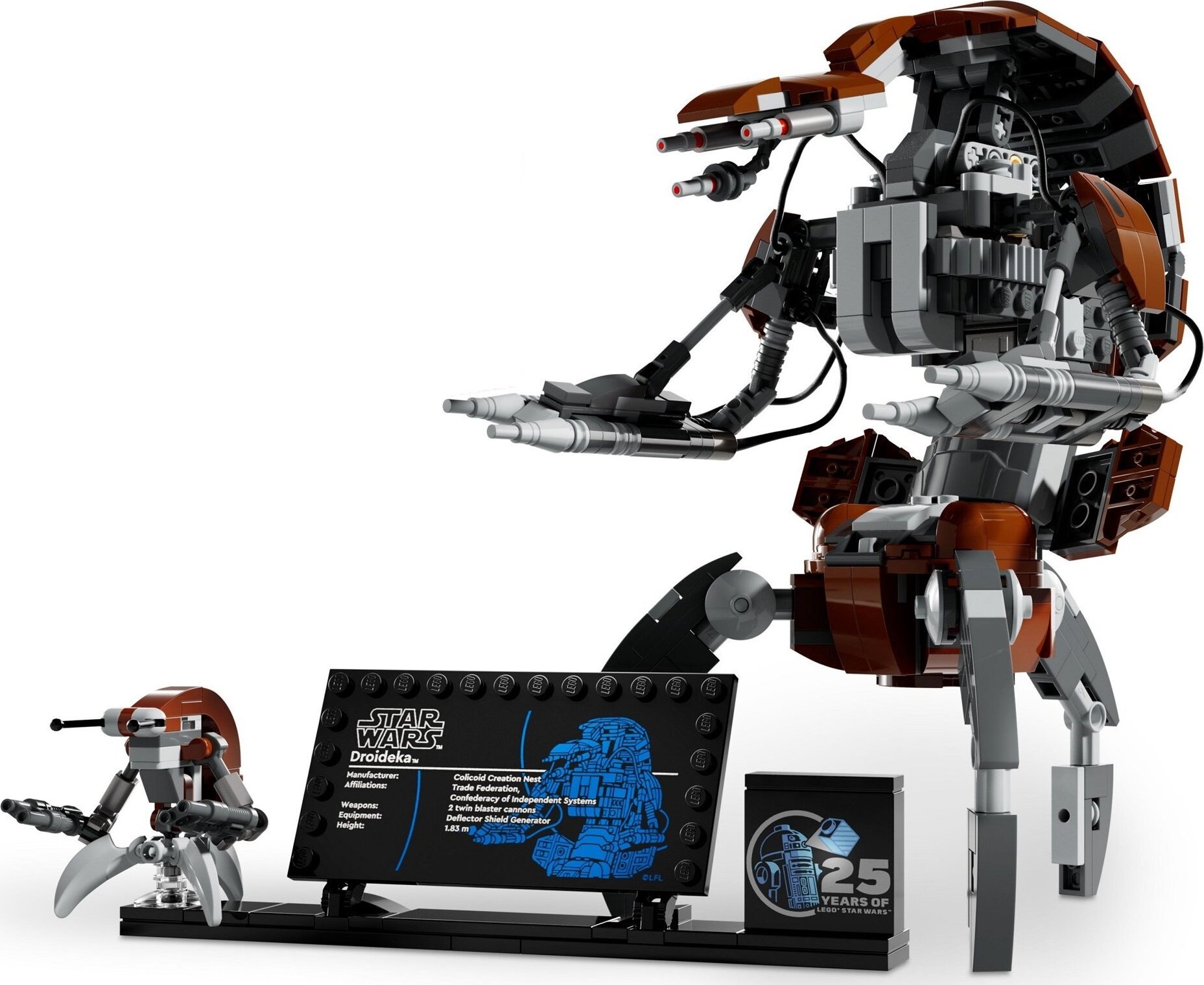 Imponujący model z okazji 25. rocznicy — ten wyjątkowy zestaw zawiera podstawkę z miejscem na małą figurkę droida LEGO® — Droidekę, tabliczkę z informacjami o droidzie oraz klocek LEGO Star Wars™ z okazji 25-lecia zestawów