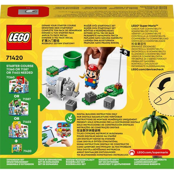 Ετοιμαστείτε για περιπέτειες LEGO® Super Mario™ με το σετ επέκτασης Rambi Rhino (71420) για ηλικίες επτά και άνω. Διαθέτει φιγούρα LEGO Rambi κατασκευασμένη από τούβλα που μπορεί να οδηγηθεί από διαδραστικές φιγούρες LEGO® Mario™, LEGO® Luigi™ ή LEGO® Peach™ (δεν περιλαμβάνονται). Όταν ο Rambi περπατά, φορτίζει τα περιλαμβανόμενα στοιβαζόμενα rock στοιχεία και εκτελεί άλλες κινήσεις, ενεργοποιούνται ηχητικά εφέ στη διαδραστική φιγούρα. Σημείωση: Το αρχικό σετ 71360, 71387 ή 71403 απαιτείται για διαδραστικό παιχνίδι.