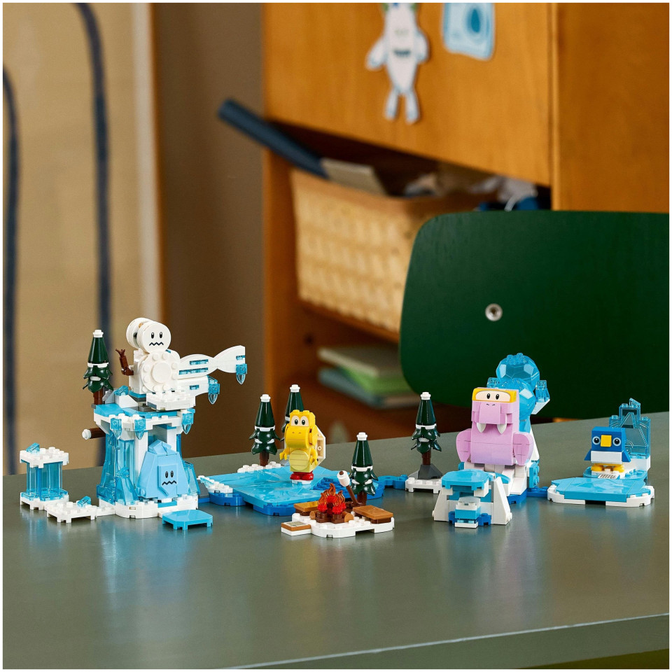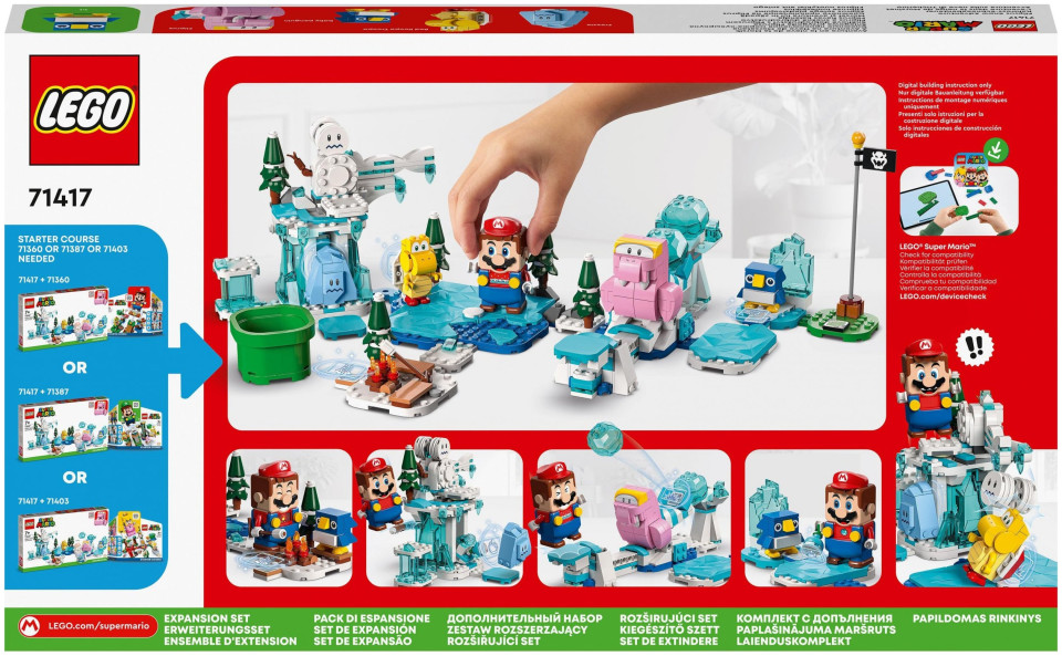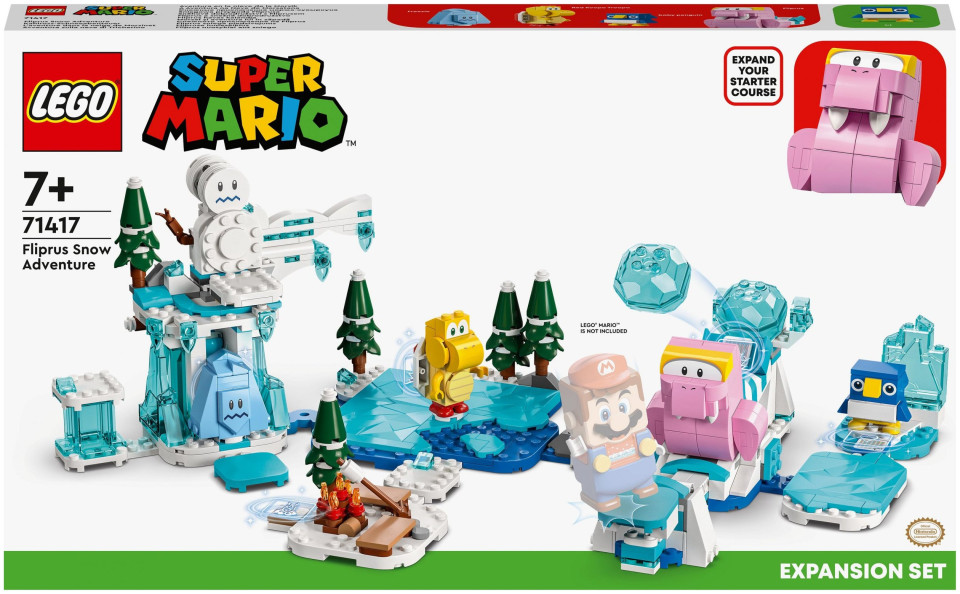 Οι νέοι κατασκευαστές μπορούν να προσθέσουν ένα συναρπαστικό επίπεδο πάγου στον κόσμο LEGO® Super Mario™ με το σετ επέκτασης περιπέτειας του Fliprus's Snow (71417) με 4 χαρακτήρες LEGO® Super Mario™. Οι παίκτες συλλέγουν ψηφιακά νομίσματα βοηθώντας τις φιγούρες LEGO® Mario™, LEGO® Luigi™ και LEGO® Peach™ (δεν περιλαμβάνονται) να νικήσουν τους κόκκινους Koopa Troopa, Freezie και Fliprus. Μπορούν να κάνουν πατινάζ στον «πάγο», να ζεσταθούν δίπλα στη φωτιά και να δώσουν κρυμμένα κατεψυγμένα φρούτα στον μικρό πιγκουίνο. (Σημείωση: Απαιτείται σετ 71360, 71387 ή 71403 για να παίξετε).