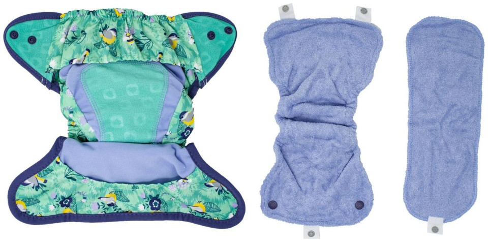 3. Τα απορροφητικά ένθετα προσαρτώνται στο κάλυμμα με κουμπώματα, ώστε το εξωτερικό μέρος της πάνας να μπορεί να επαναχρησιμοποιηθεί. Το ίδιο το κάλυμμα στεγνώνει γρήγορα, οπότε μετά το πλύσιμο μπορεί να χρησιμοποιηθεί ξανά σύντομα.