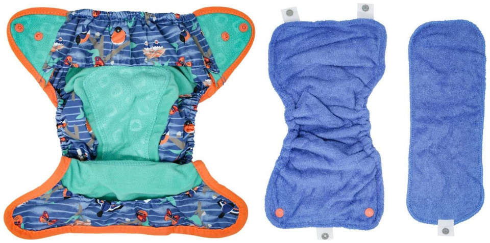 3. Τα απορροφητικά ένθετα προσαρτώνται στο κάλυμμα με κουμπώματα, ώστε το εξωτερικό μέρος της πάνας να μπορεί να επαναχρησιμοποιηθεί. Το ίδιο το κάλυμμα στεγνώνει γρήγορα, οπότε μετά το πλύσιμο μπορεί να χρησιμοποιηθεί ξανά σύντομα.