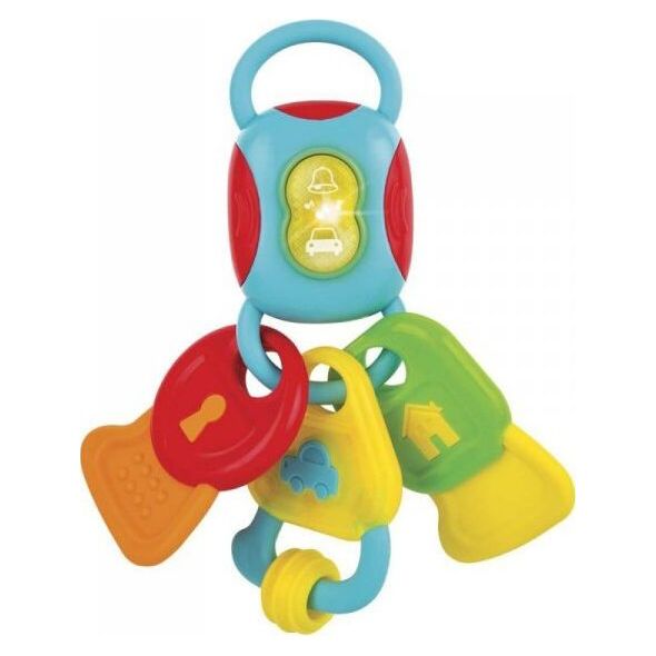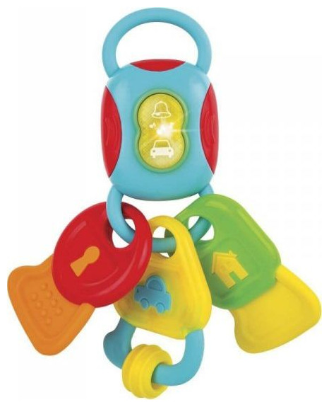 Przyjemne, żywe kolory przyciągną uwagę każdego maluszka zachęcając do zabawy.Zabawka może pełnić również funkcję gryzaczka.To zawieszka przypominająca prawdziwe kluczyki samochodowe.Ma przyciski funkcyjny który uruchamia dźwięki, odgłosy i śmieszne melodyjki.Cechy zabawki:lekkie, łatwe do chwytaniaświatełko, dźwięki, zabawne melodieróżnorodna tekstura kluczyków dostosowana do złagodzenia ząbkowaniastymulują wzrok i dotyk