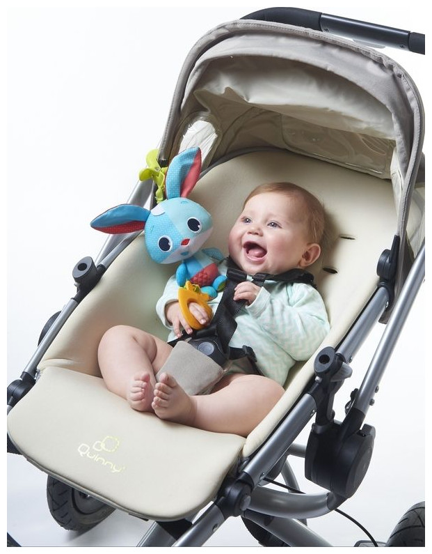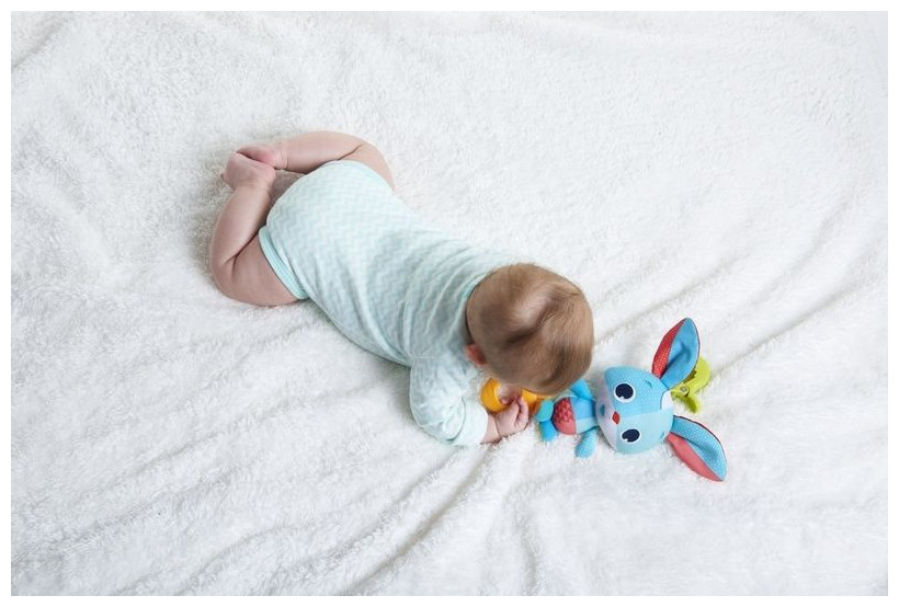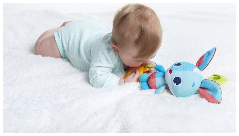 Το παιδί αρχίζει να ελέγχει τις κινήσεις των χεριών και να πιάνει κρεμαστά παιχνίδια. Το τράβηγμα του κουνελιού το κάνει να δονείται.