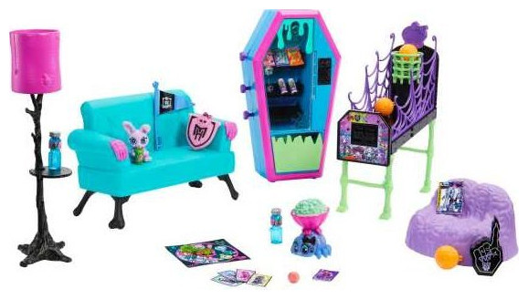 Lalki Monster High™ mogą wygodnie odpocząć na kanapie, popijając „shake’a”, zagrać na automacie do gier lub poczytać na sofie. Lalki nie znajdują się w zestawie.