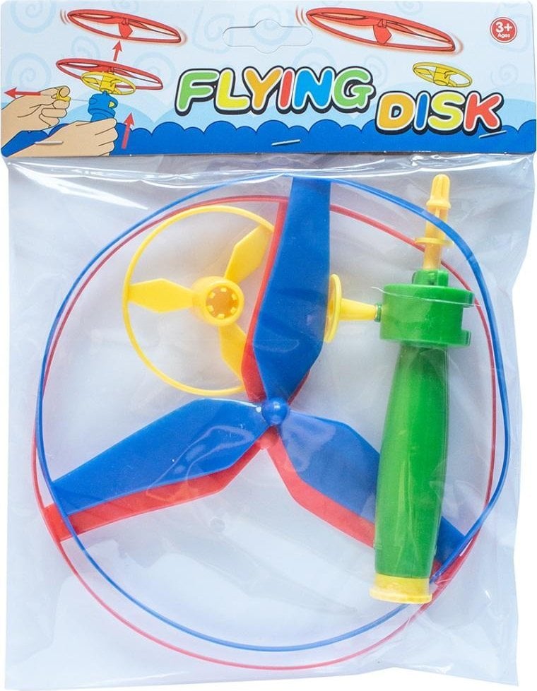 Łatwe do uruchomienia - śmigło montuje się na wyrzutni, a dysk wprawia się w ruch (lot) poprzez pociągnięcie linki.średnica dysku-śmigała 19 cm (w zestawie 2 dyski)