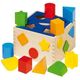Klasyczny sorter do nauki rozróżniania kształtów. Do drewnianej skrzynki należy wrzucić przez wieczko 10 klocków o różnych kształtach i kolorach.